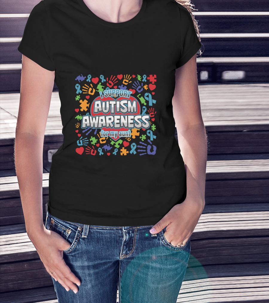 I Support Autism Awareness For My Aunt Colorful Puzzle Ribbon Hearts Hands T-Shirt