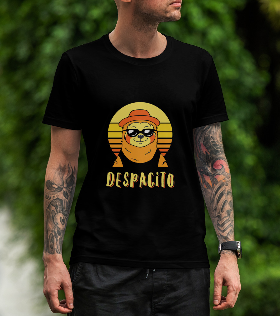 The Despacito Sloth Art with Retro Sunset and Stylish Hat T-shirt is designed for everyday wear and a consistent fit. Fabric is pre-shrunk ring-spun cotton with durable stitching. See the size chart below for exact measurements.