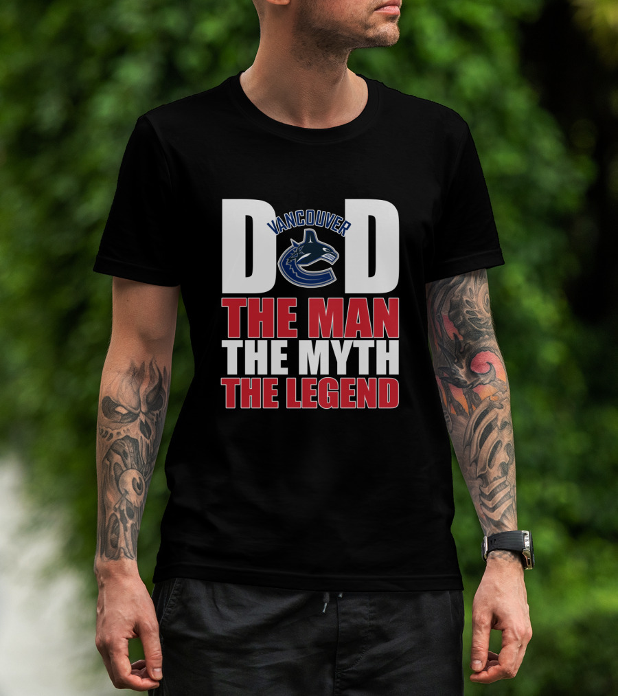 The Vancouver Canucks Dad The Man The Myth The Legend T-shirt is designed for everyday wear and a consistent fit. Fabric is pre-shrunk ring-spun cotton with durable stitching. See the size chart below for exact measurements.