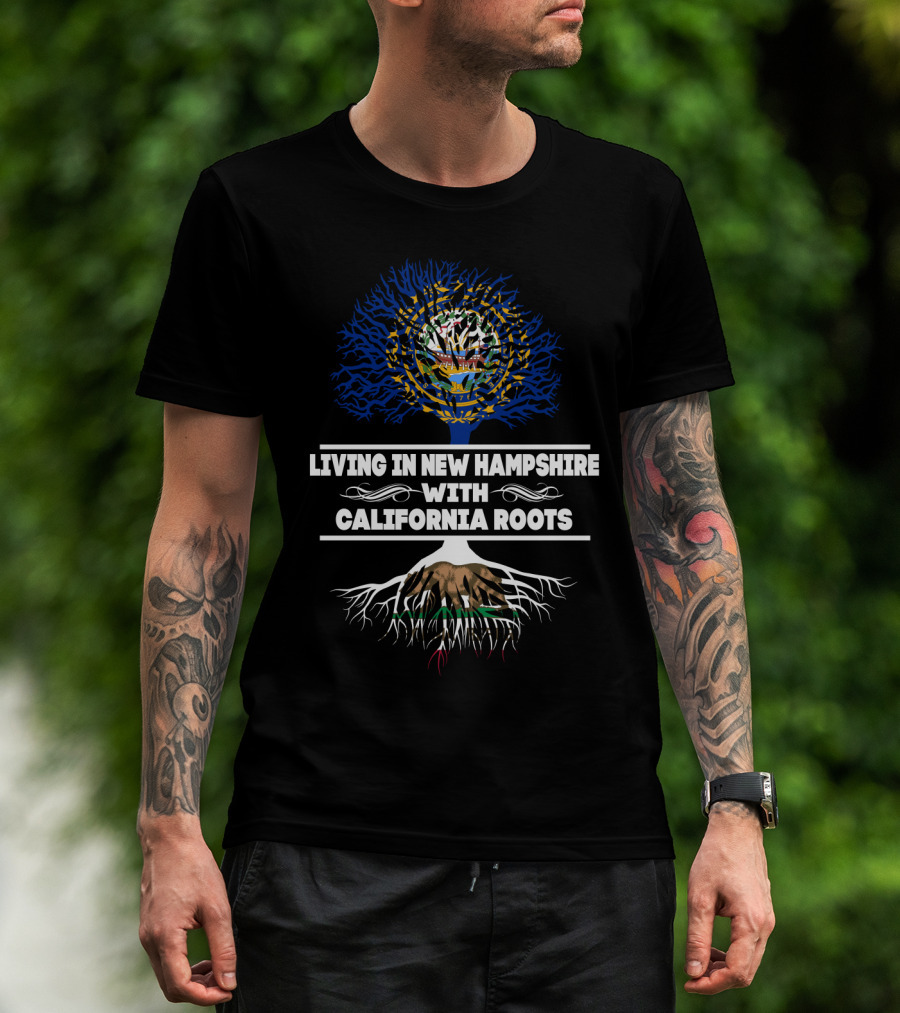 Living In New Hampshire With California Roots Featuring New Hampshire State Seal And California Bear Tree T-Shirt