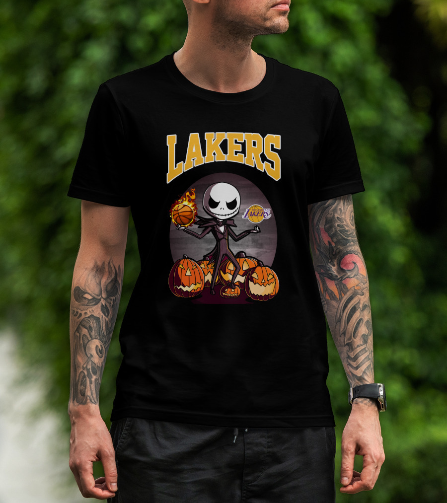 Lakers Jack Skellington Halloween Basketball With Pumpkins And Los Angeles Lakers T-Shirt