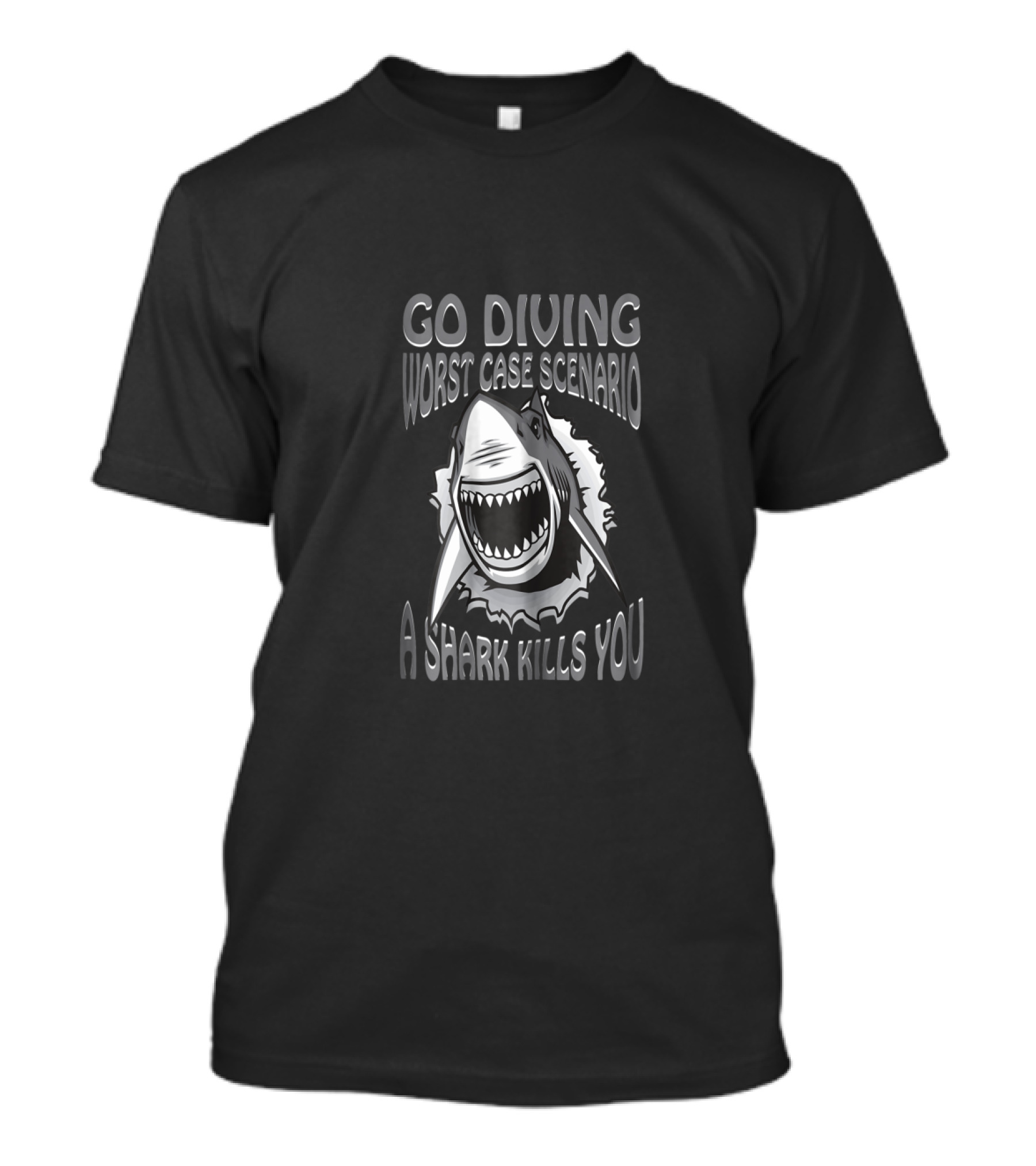 The Go Diving Worst Case Scenario A Shark Kills You Bold Shark T-shirt is designed for everyday wear and a consistent fit. Fabric is pre-shrunk ring-spun cotton with durable stitching. See the size chart below for exact measurements.