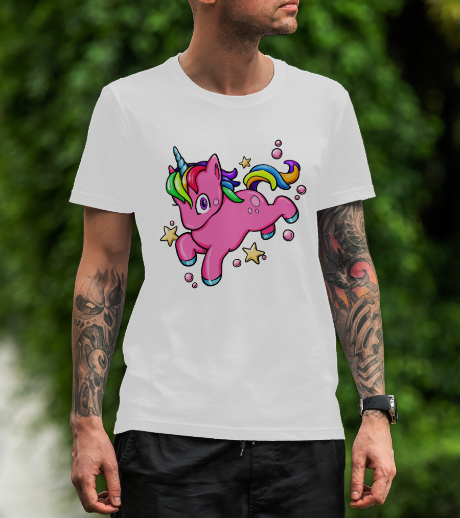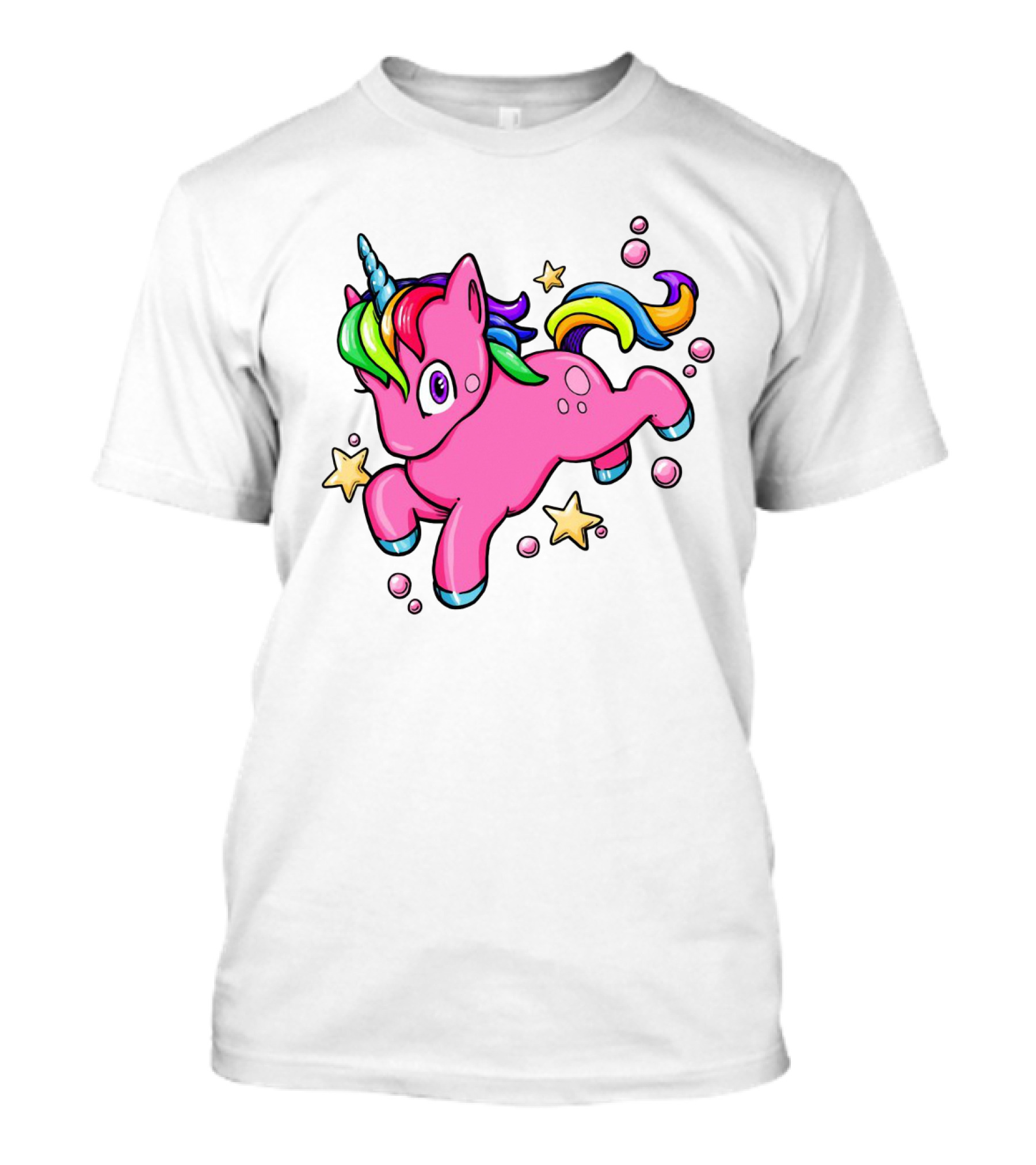 The Playful Pink Unicorn with Rainbow Mane and Colorful Stars T-shirt is designed for everyday wear and a consistent fit. Fabric is pre-shrunk ring-spun cotton with durable stitching. See the size chart below for exact measurements.
