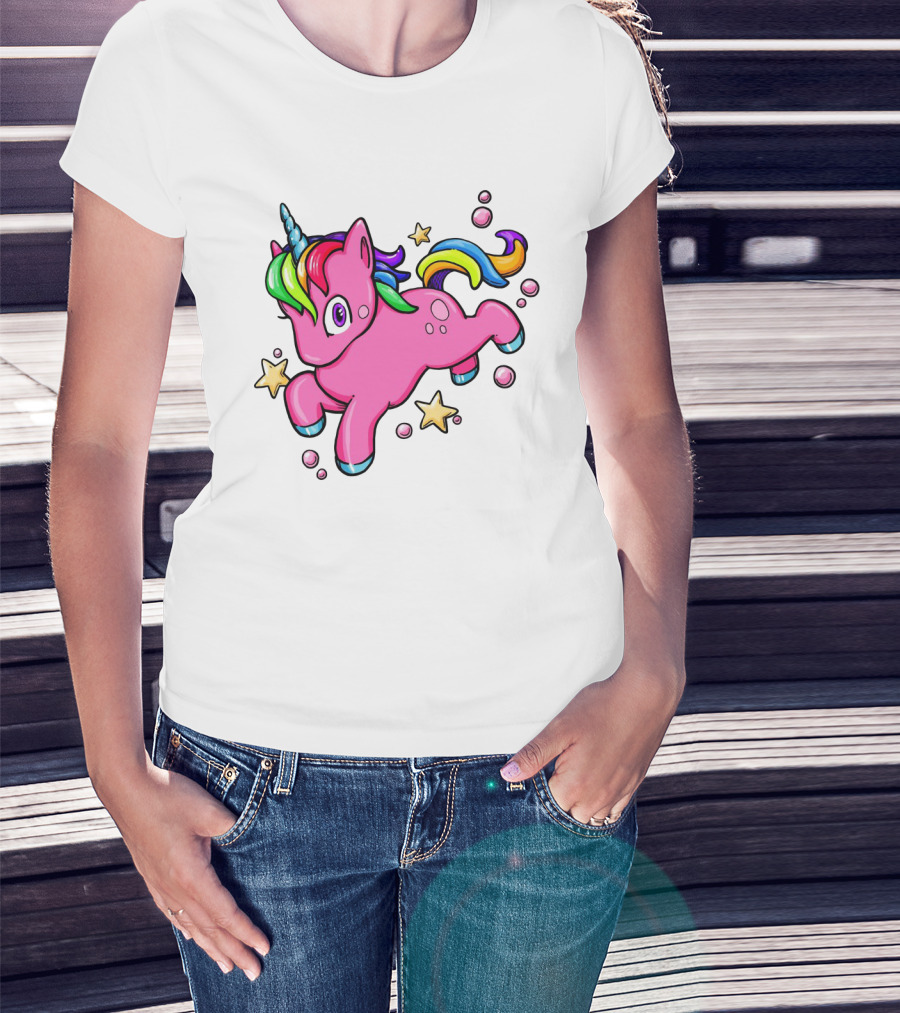Playful Pink Unicorn With Rainbow Mane And Colorful Stars T-Shirt