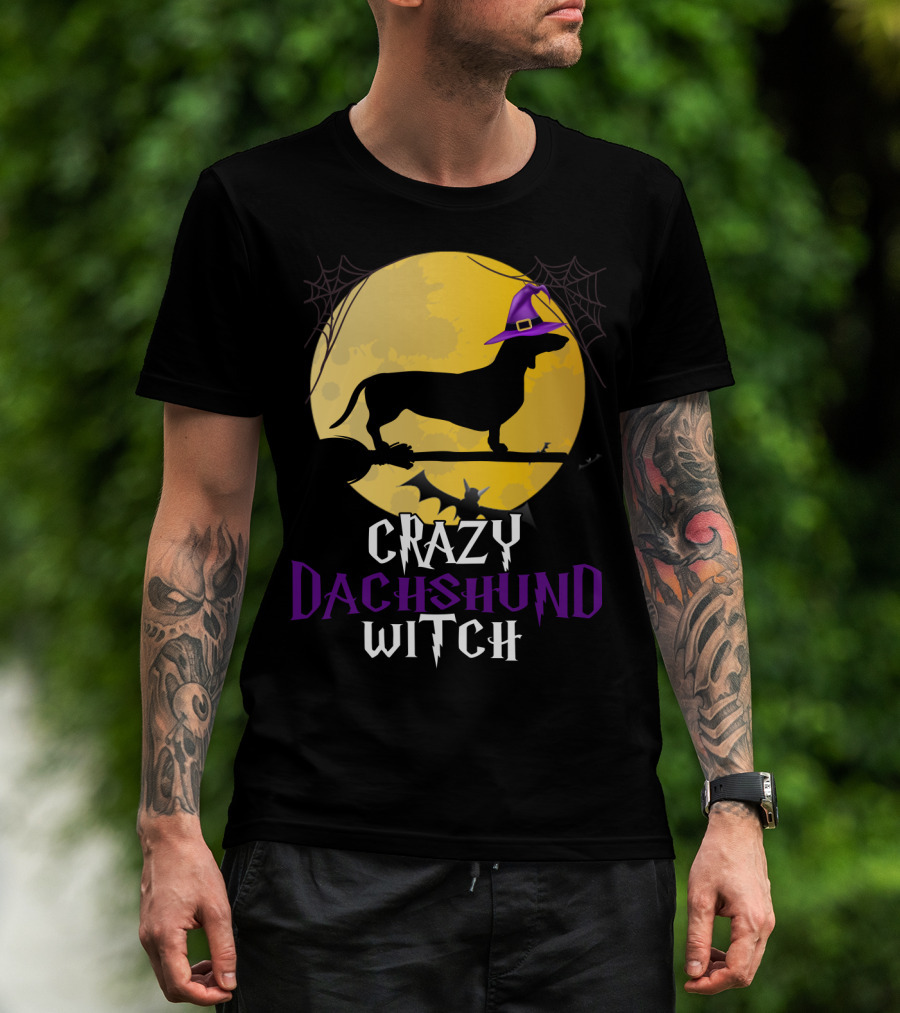 The Crazy Dachshund Witch Dog Halloween Moon Silhouette with Broomstick and Purple Hat T-shirt is designed for everyday wear and a consistent fit. Fabric is pre-shrunk ring-spun cotton with durable stitching. See the size chart below for exact measurements.