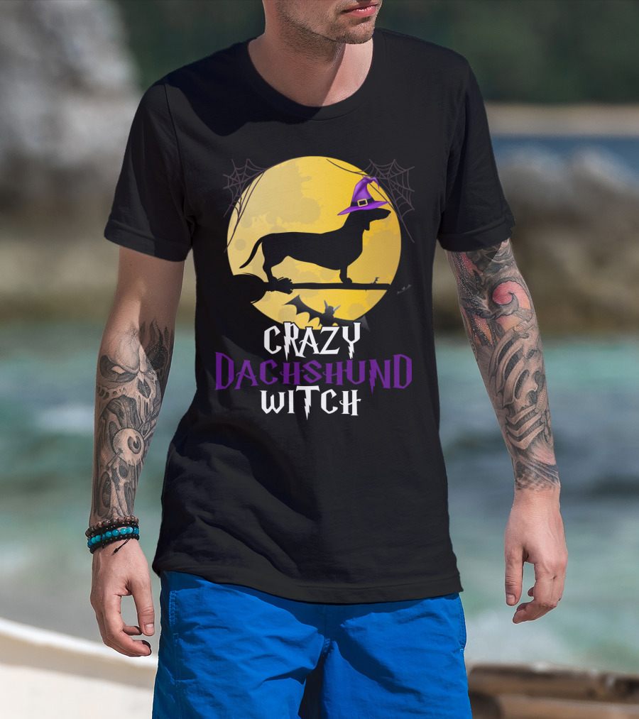 Crazy Dachshund Witch Dog Halloween Moon Silhouette With Broomstick And Purple Hat T-Shirt