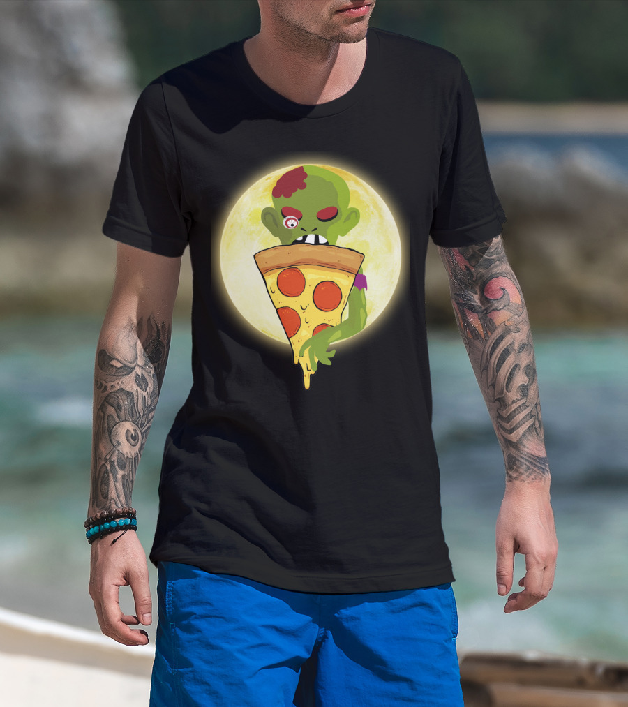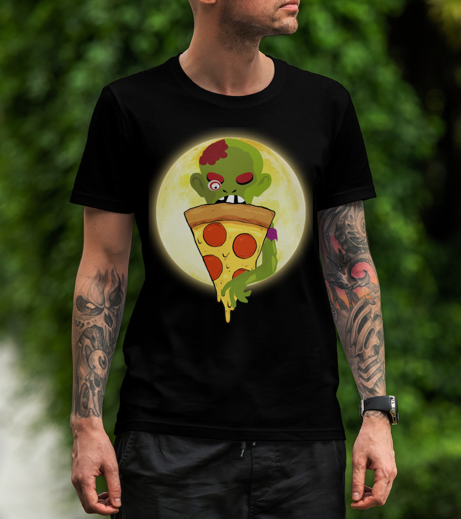 Zombie Eating Pepperoni Pizza Under Full Moon T-Shirt