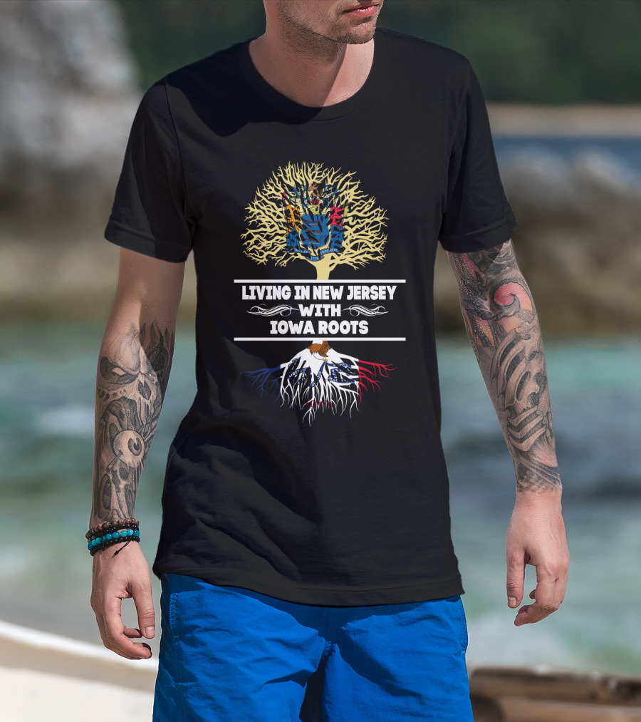 Living In New Jersey With Iowa Roots Tree Design Featuring State Flag Colors T-Shirt