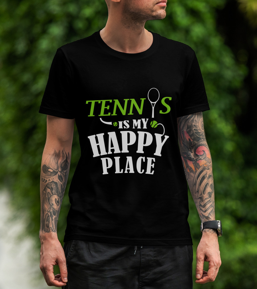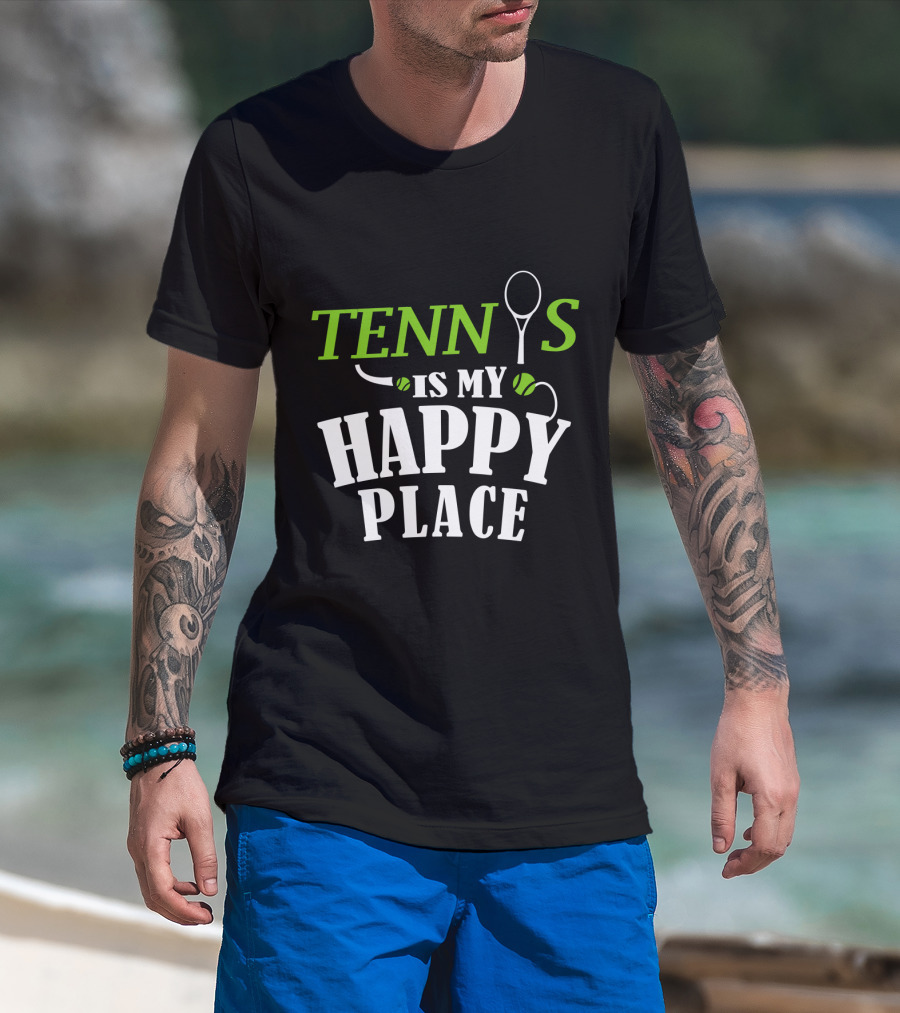 Tennis Is My Happy Place With Racket And Ball Motif T-Shirt
