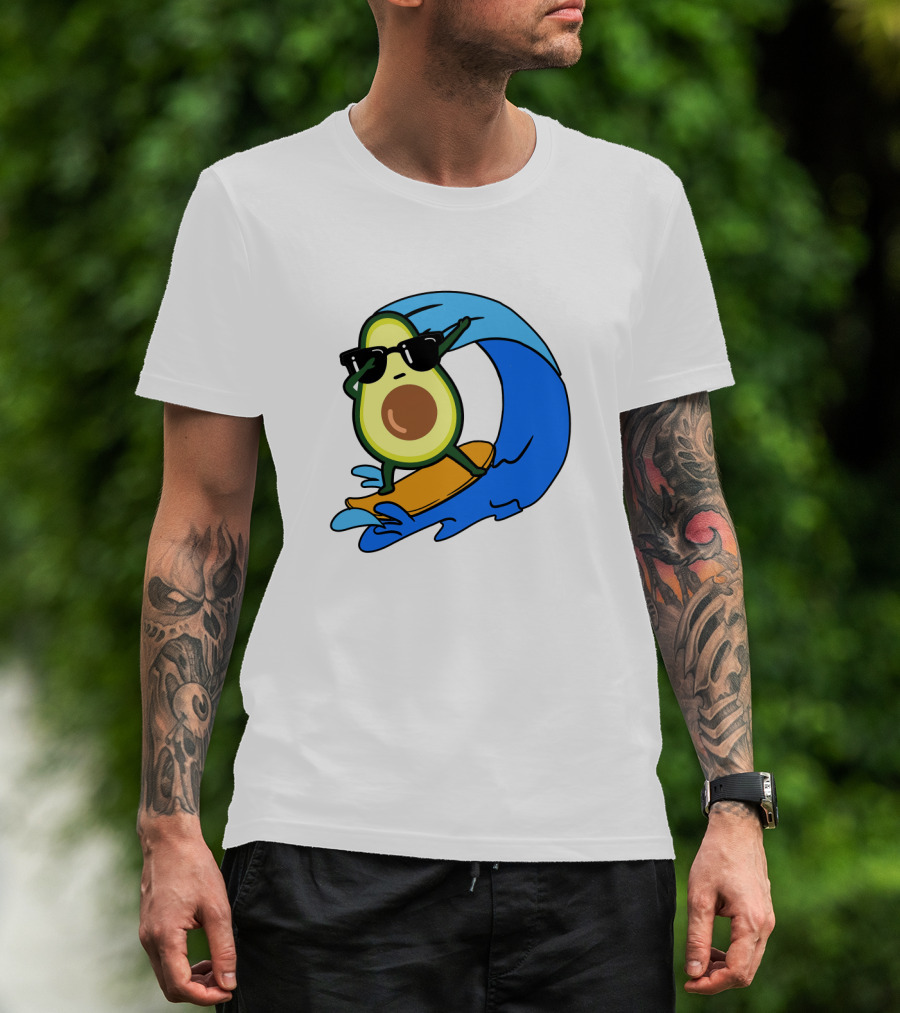 The Avocado Wearing Sunglasses Riding Blue Ocean Wave T-shirt is designed for everyday wear and a consistent fit. Fabric is pre-shrunk ring-spun cotton with durable stitching. See the size chart below for exact measurements.