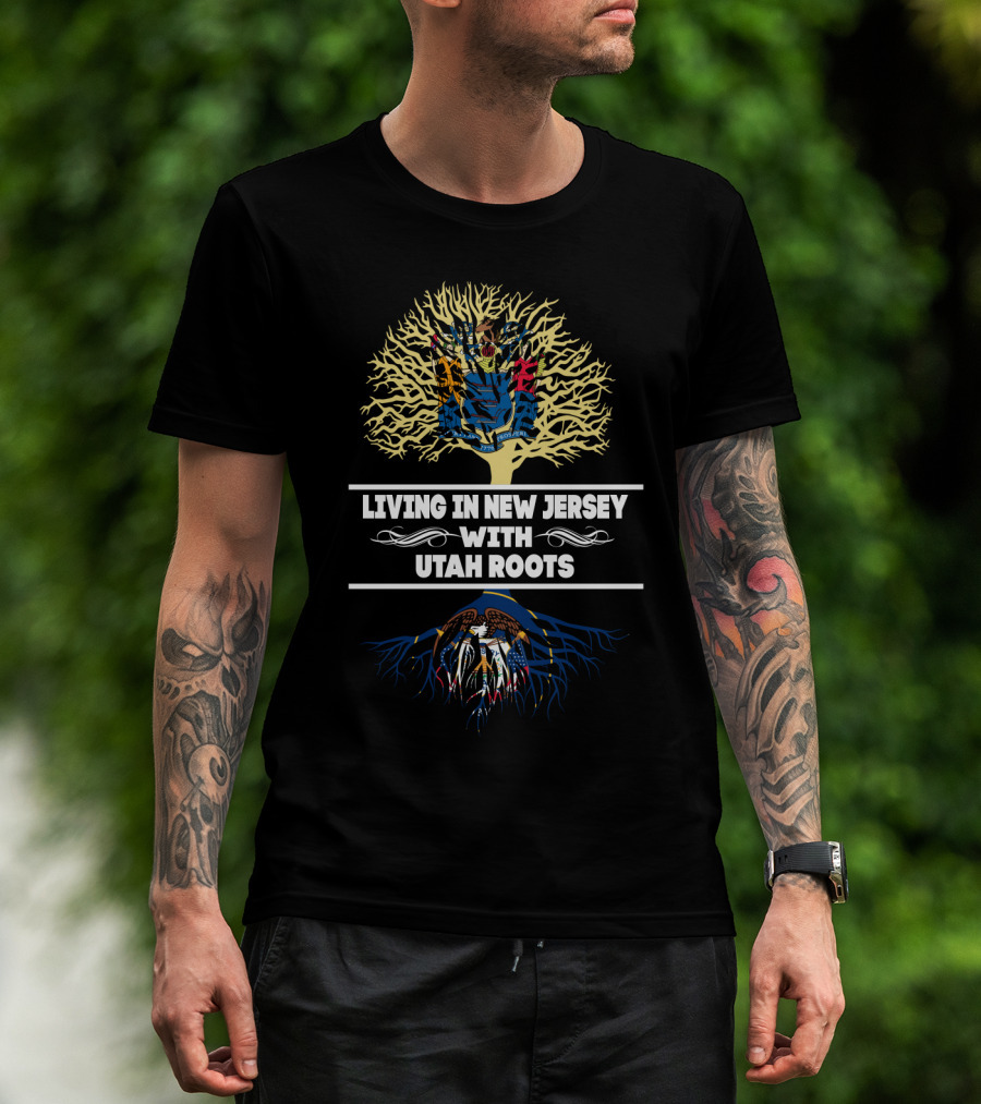 The Living in New Jersey With Utah Roots Featuring Iconic State Seal Tree T-shirt is designed for everyday wear and a consistent fit. Fabric is pre-shrunk ring-spun cotton with durable stitching. See the size chart below for exact measurements.