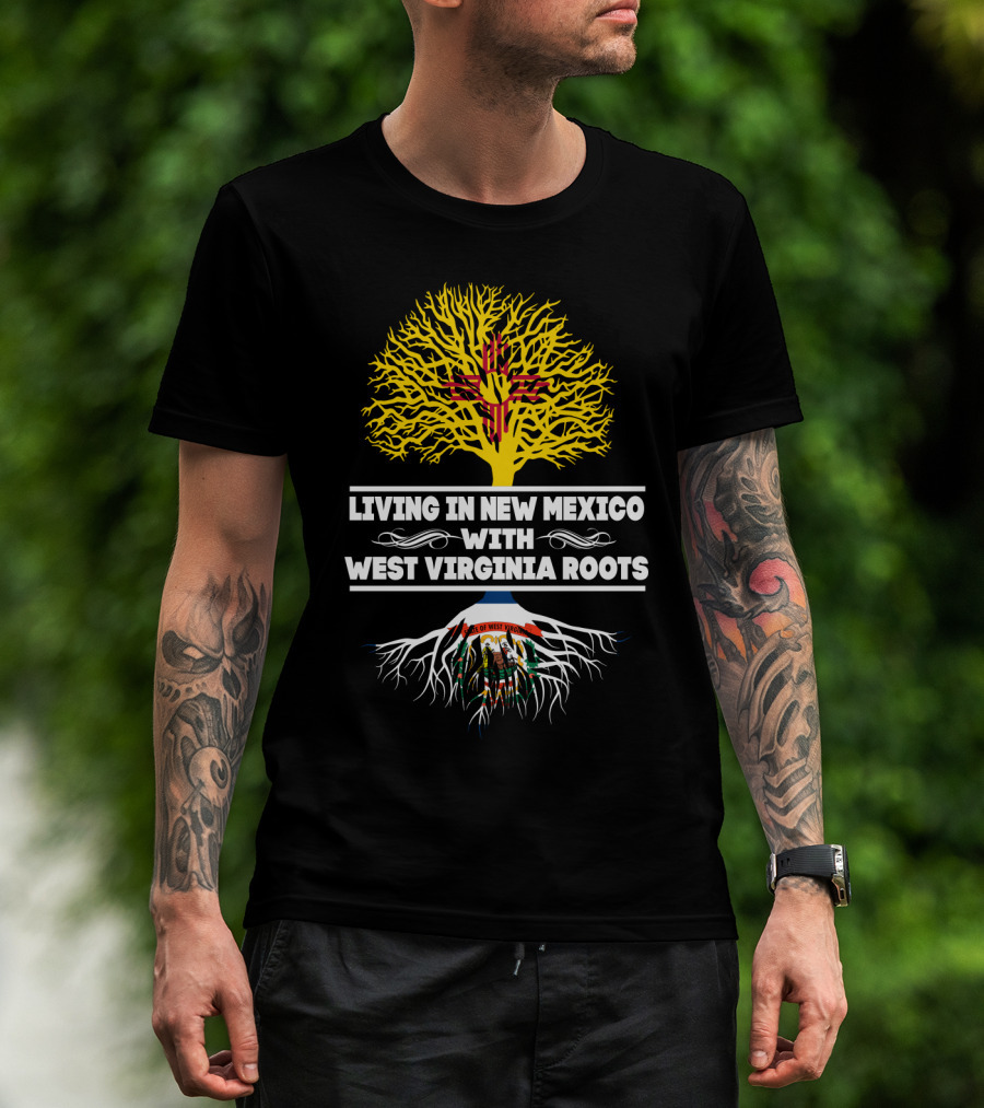 How much will this Living in New Mexico With West Virginia Roots Zia Symbol and State Seal Tree shirt shrink?