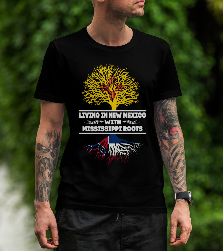 Living In New Mexico With Mississippi Roots Yellow Zia Tree Red Blue Roots T-Shirt