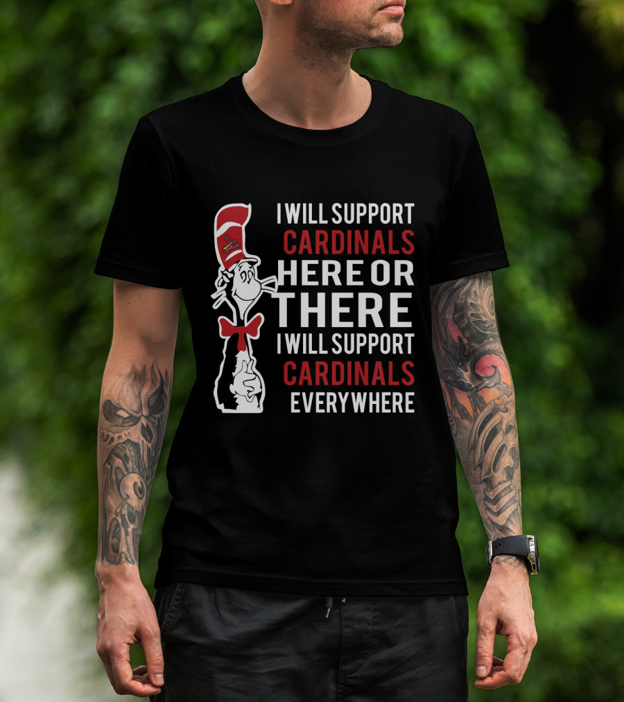 I Will Support Cardinals Here Or There Cat In The Hat St. Louis Cardinals Everywhere T-Shirt