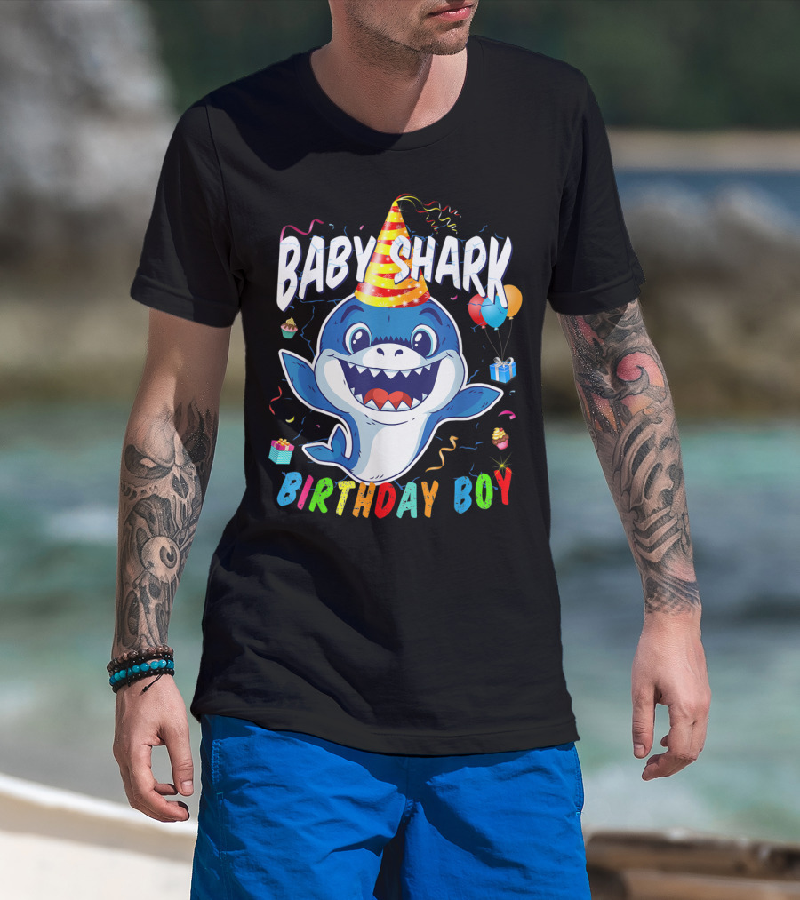 Baby Shark Birthday Boy Celebration With Party Hat And Balloons T-Shirt