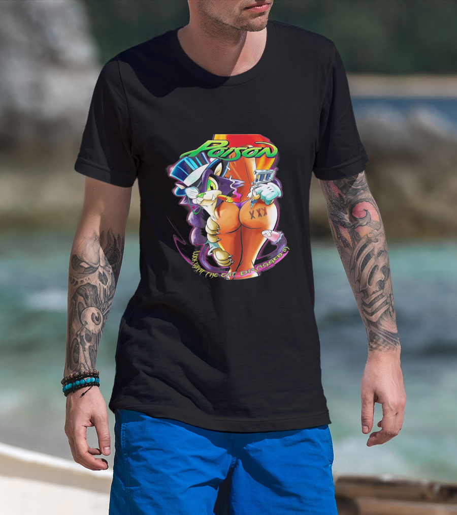 The Poison Cartoon Cat Holding Tattoo Gun Text 'Look What the Cat Dragged In' T-shirt is designed for everyday wear and a consistent fit. Fabric is pre-shrunk ring-spun cotton with durable stitching. See the size chart below for exact measurements.
