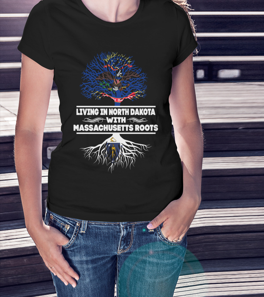 North Dakota Living With Massachusetts Roots And State Flags Tree T-Shirt