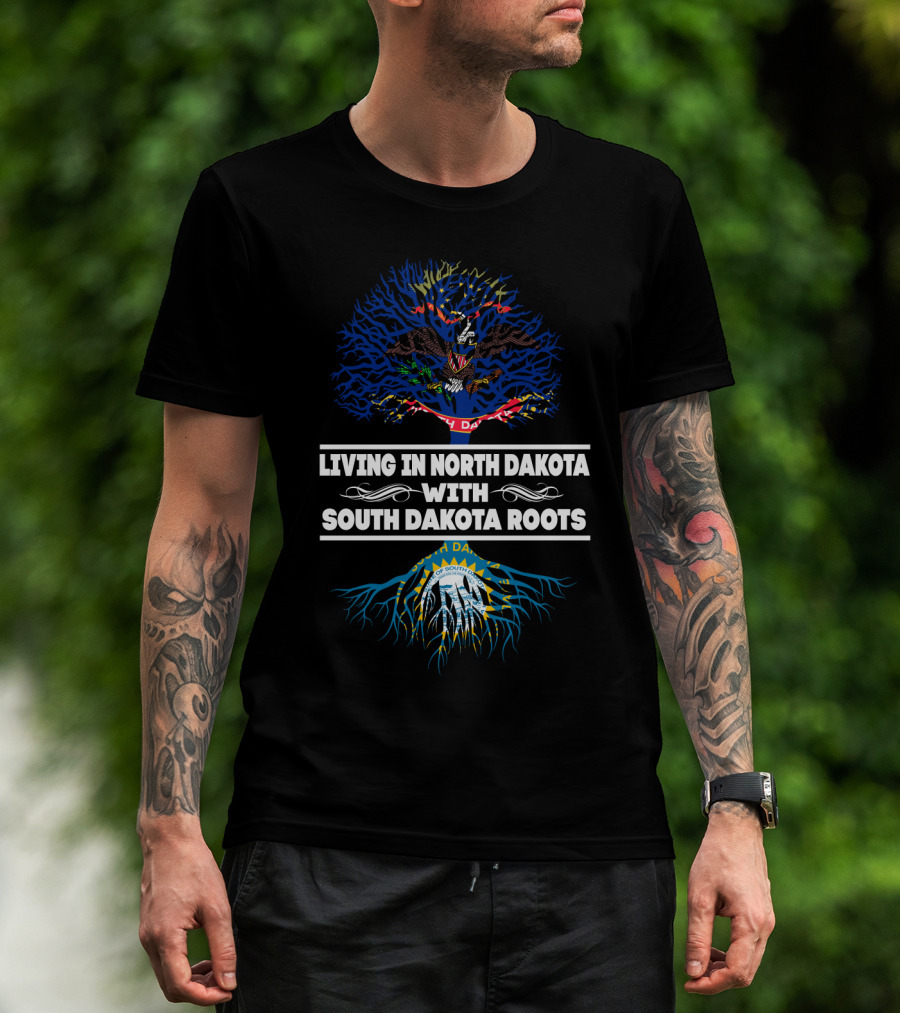 Living In North Dakota With South Dakota Roots Featuring State Symbols And Tree T-Shirt
