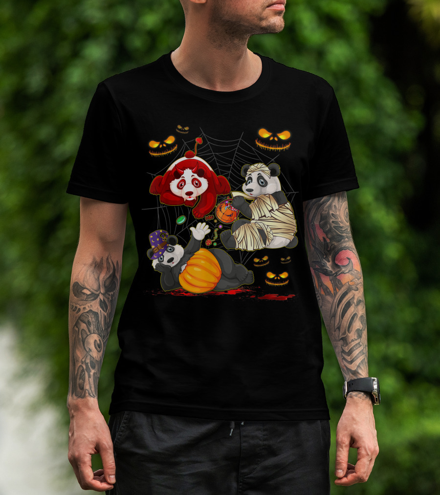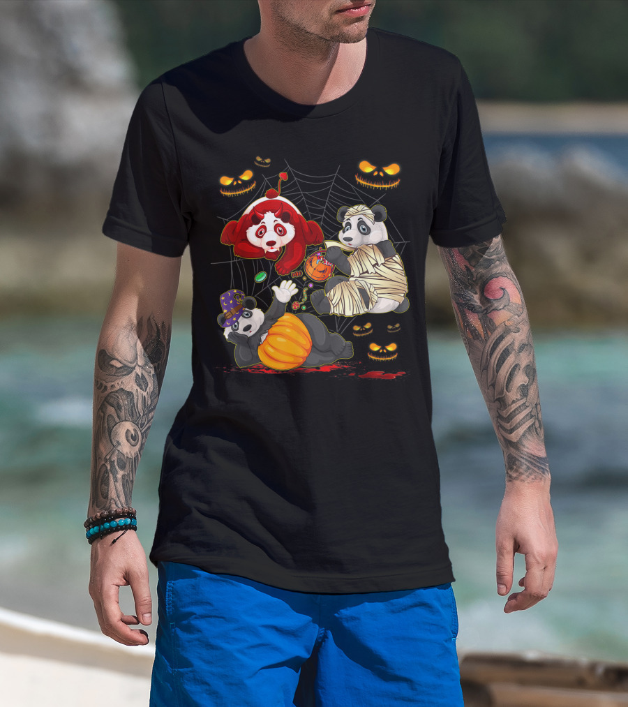Halloween Panda Trio Mummy Clown Pumpkin Costume With Spider Web And Jack-o'-Lanterns T-Shirt