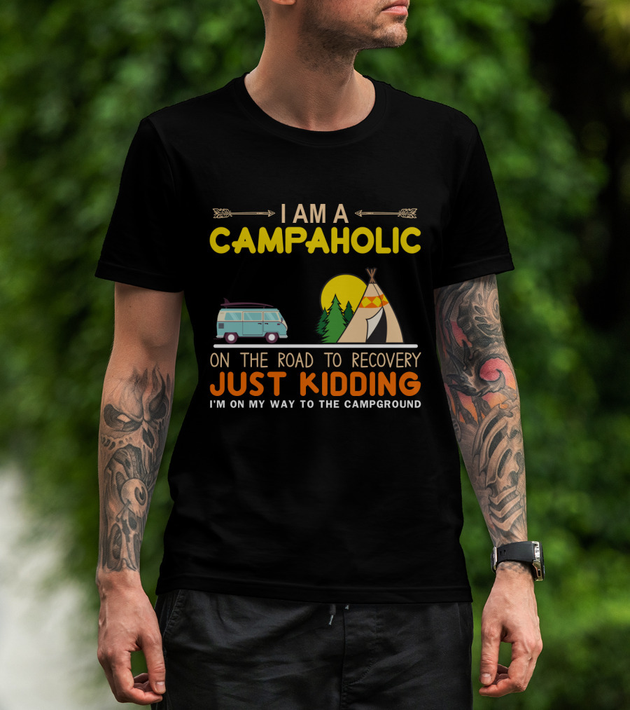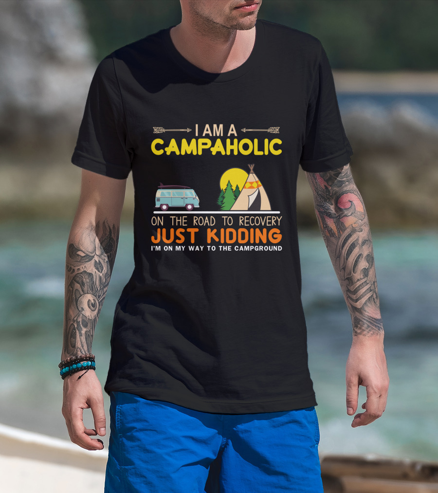 I Am A Campaholic On The Road To Recovery Just Kidding I'm On My Way To The Campground Camper Van Tent Forest Sun T-Shirt