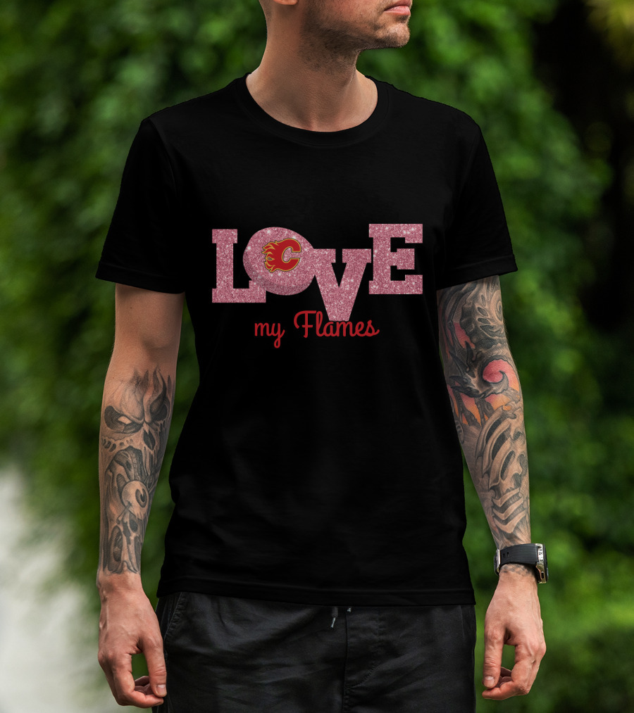 The Calgary Flames Glitter Love My Flames T-shirt is designed for everyday wear and a consistent fit. Fabric is pre-shrunk ring-spun cotton with durable stitching. See the size chart below for exact measurements.