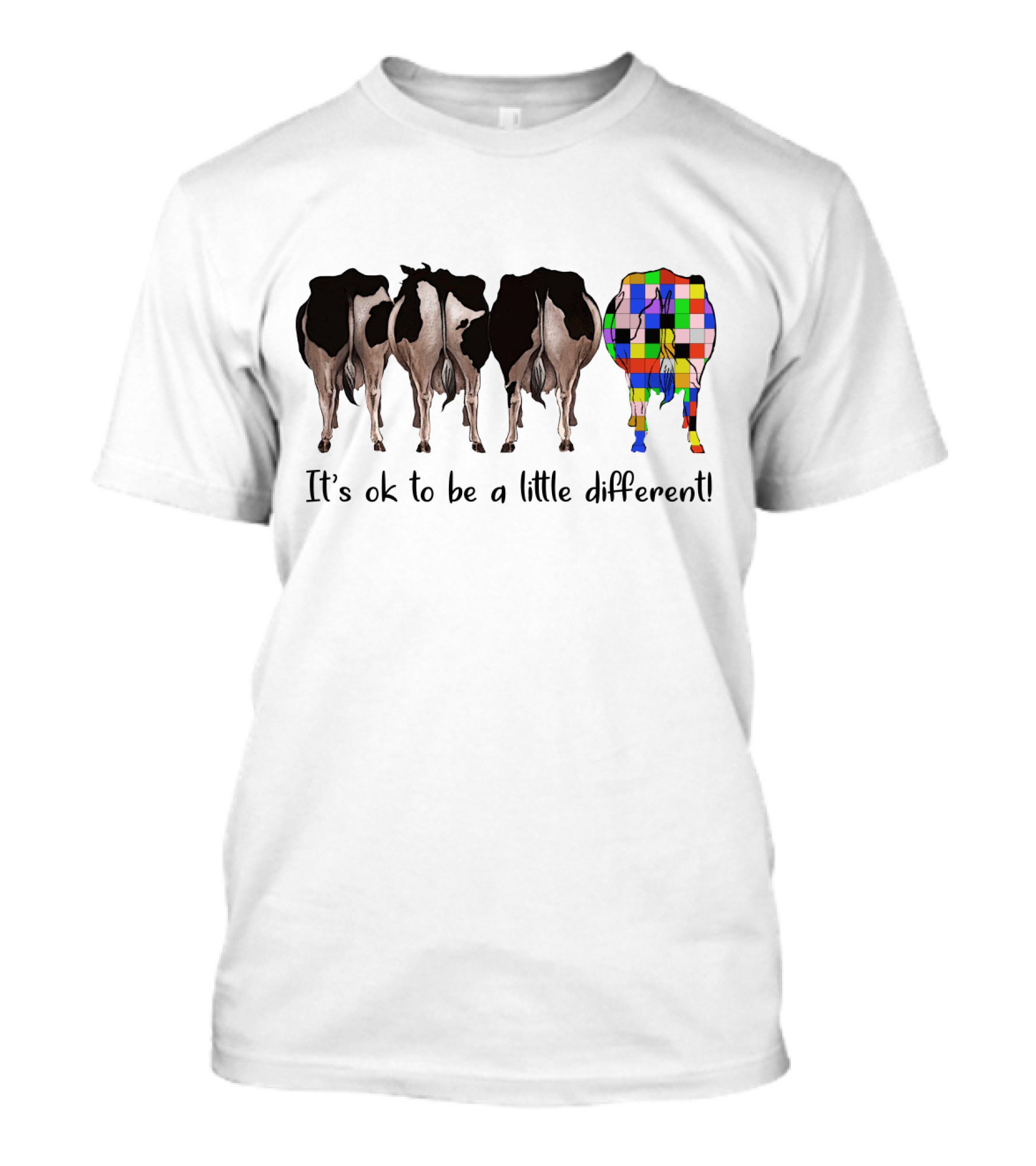The It's Ok to Be a Little Different Colorful Patchwork Cow T-shirt is designed for everyday wear and a consistent fit. Fabric is pre-shrunk ring-spun cotton with durable stitching. See the size chart below for exact measurements.