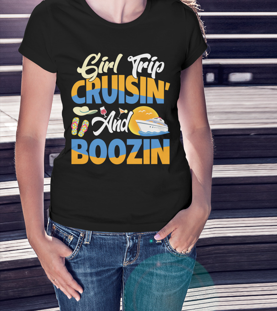 How much will this Girl Trip Cruisin' And Boozin' with Flip-Flops, Sun Hat, Drinks, and Cruise Ship Sunset shirt shrink?
