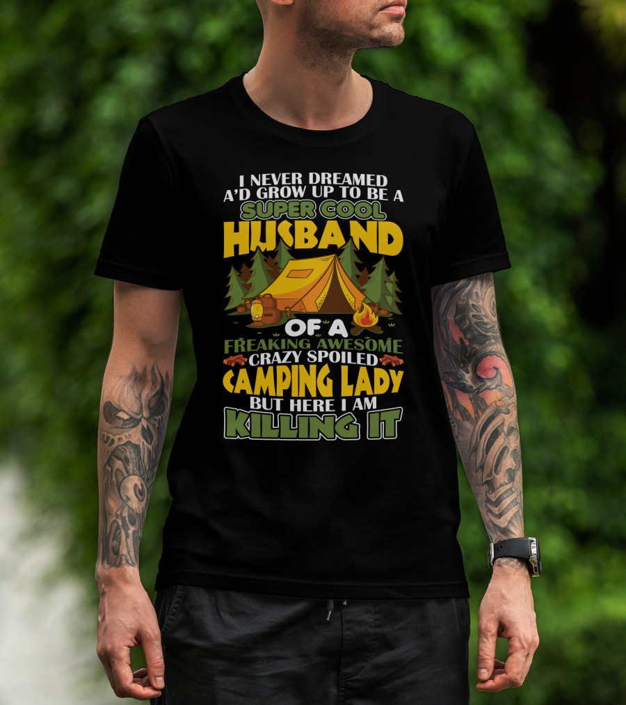 I Never Dreamed I'd Grow Up To Be A Super Cool Husband Of A Freaking Awesome Crazy Spoiled Camping Lady But Here I Am Killing It T-Shirt