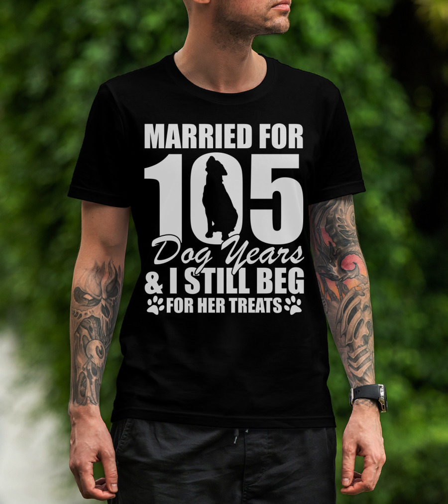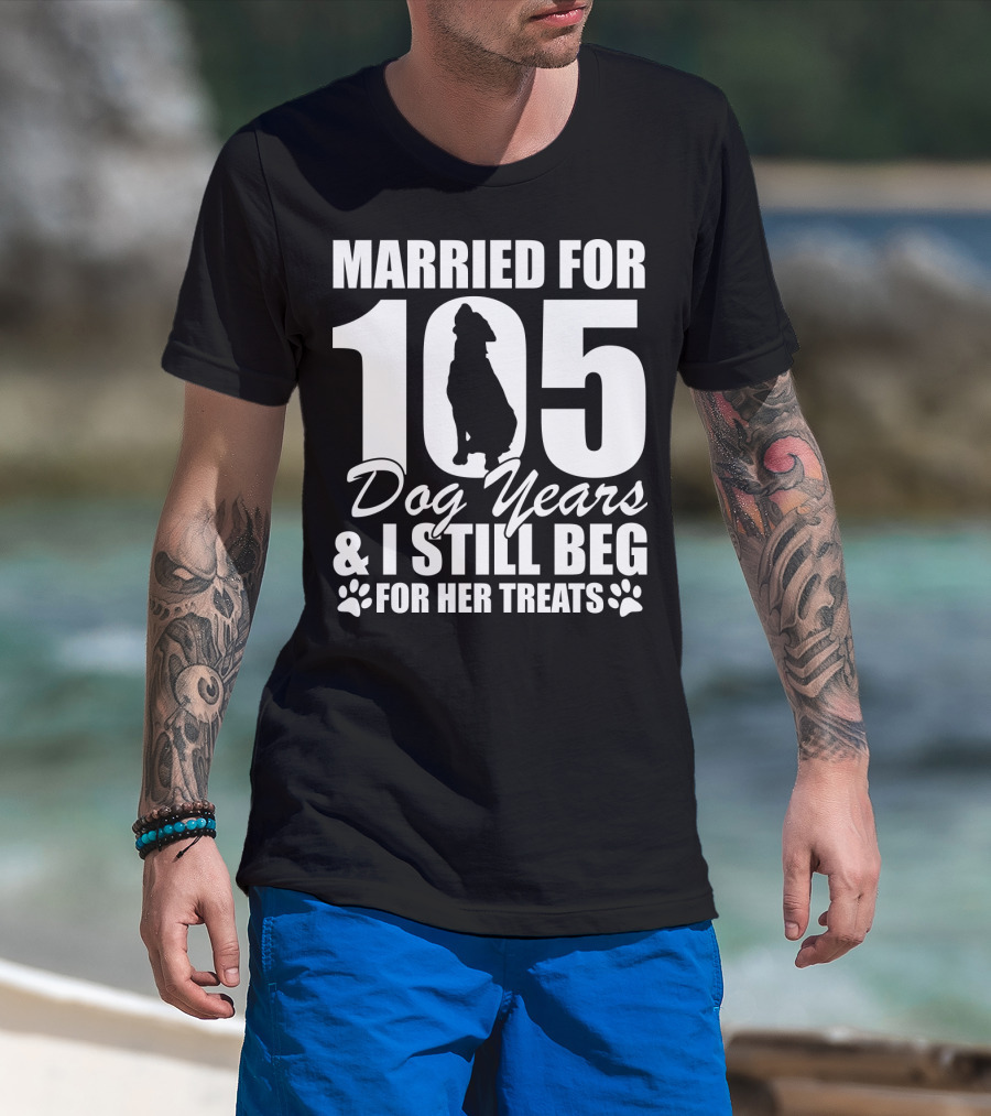 The Married For 105 Dog Years I Still Beg For Her Treats With Paw Prints and Dog T-shirt is designed for everyday wear and a consistent fit. Fabric is pre-shrunk ring-spun cotton with durable stitching. See the size chart below for exact measurements.