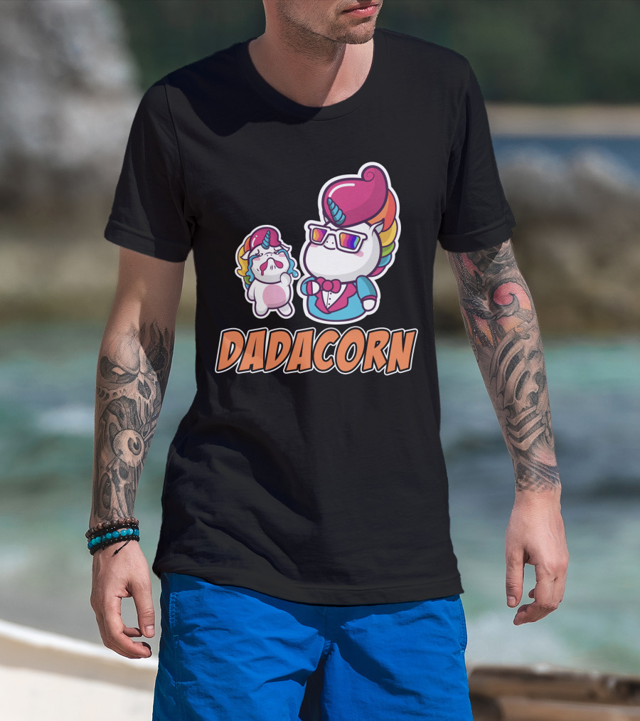 The Dadacorn Unicorn Dad and Baby with Rainbow Outfits and Sunglasses T-shirt is designed for everyday wear and a consistent fit. Fabric is pre-shrunk ring-spun cotton with durable stitching. See the size chart below for exact measurements.