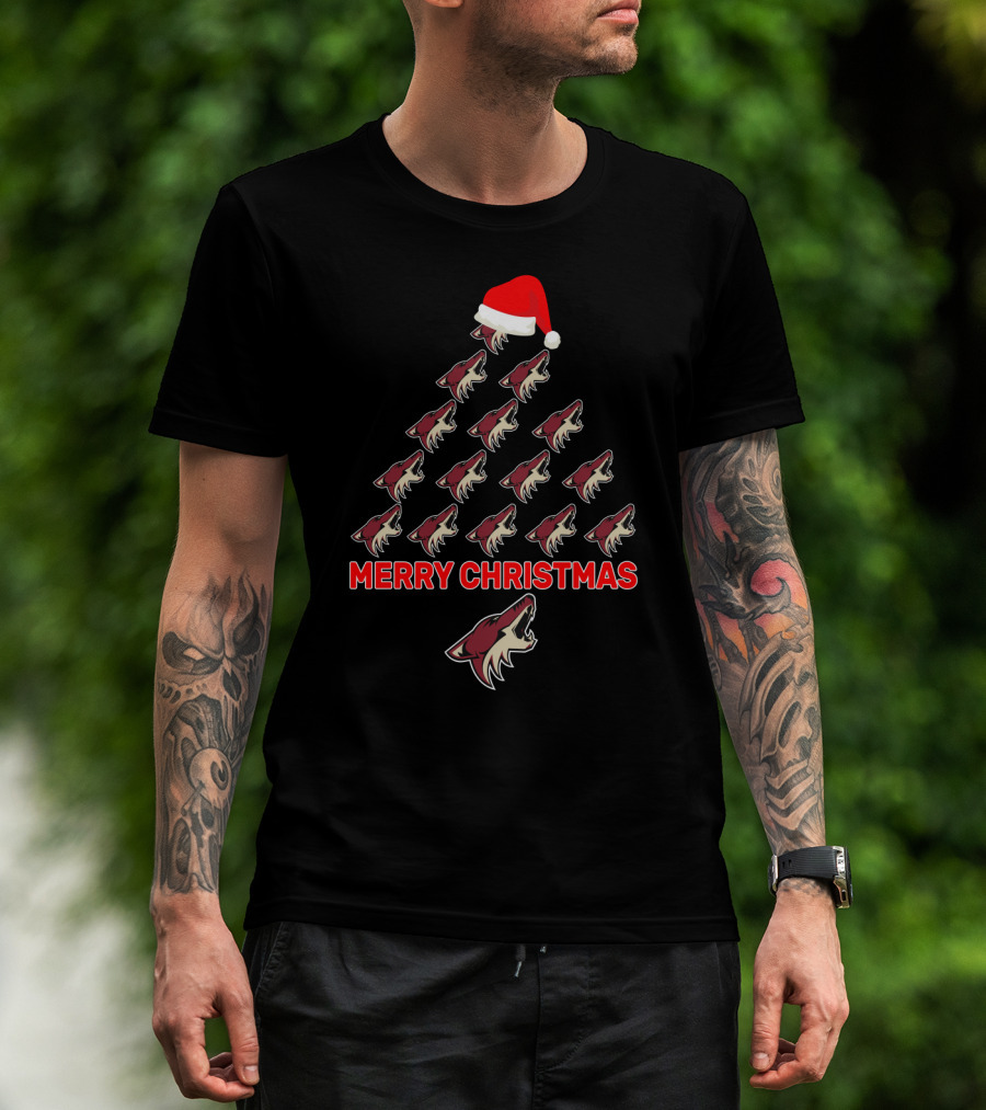 Merry Christmas Tree With Arizona Coyotes Logos And Santa Hat T-Shirt