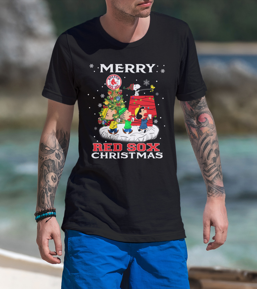 Merry Boston Red Sox Christmas Snoopy And Peanuts Characters Festive Holiday Scene T-Shirt