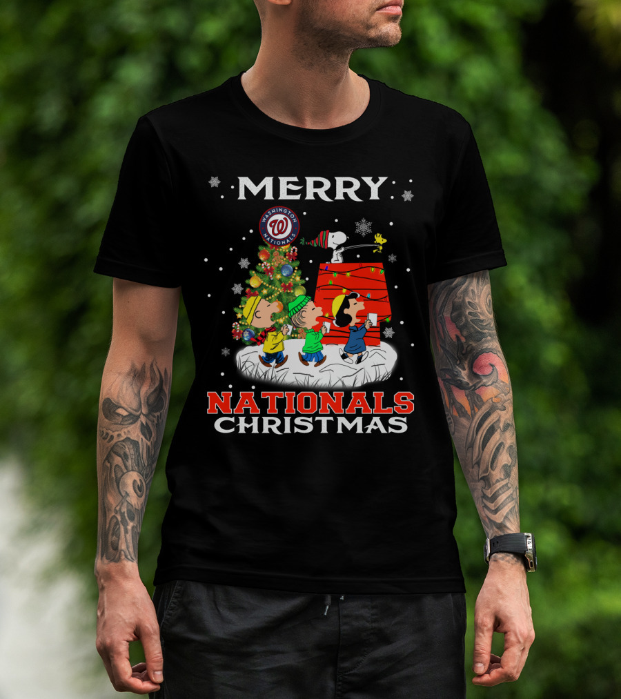 Merry Washington Nationals Christmas Snoopy With Peanuts Characters Decorate Tree T-Shirt