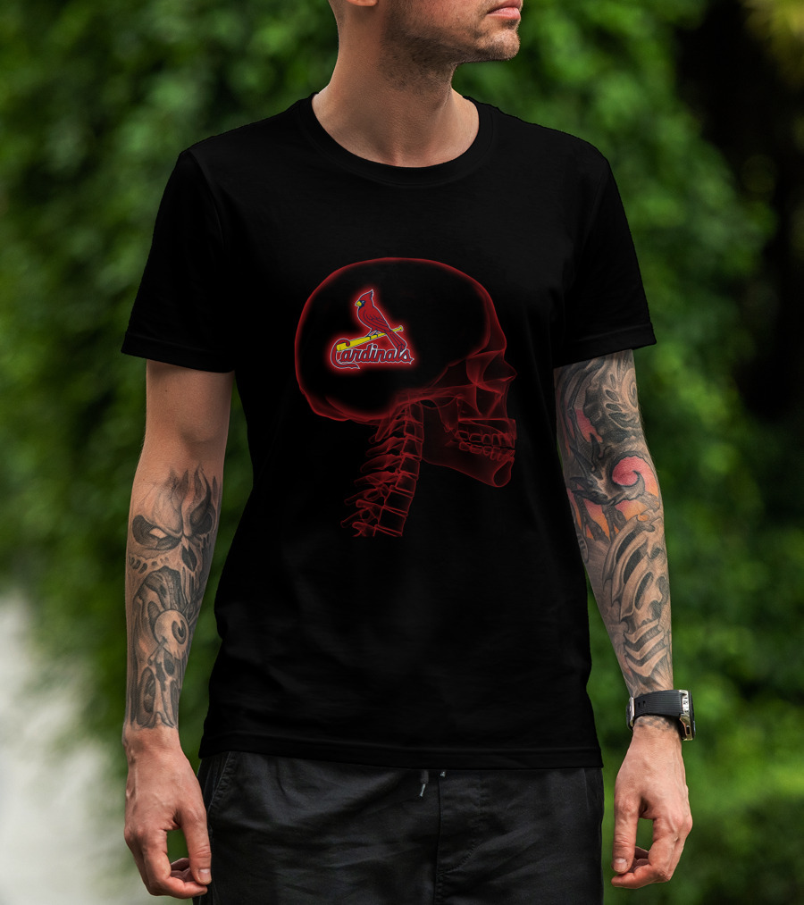 The St. Louis Cardinals Inside Brain Neon Skull Logo Red Outline T-shirt is designed for everyday wear and a consistent fit. Fabric is pre-shrunk ring-spun cotton with durable stitching. See the size chart below for exact measurements.