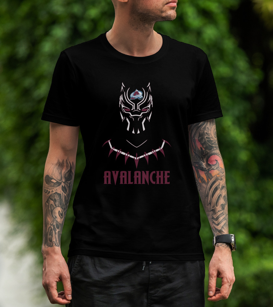 The Avalanche Black Panther Crossover Featuring Colorado Avalanche Logo and Necklace T-shirt is designed for everyday wear and a consistent fit. Fabric is pre-shrunk ring-spun cotton with durable stitching. See the size chart below for exact measurements.