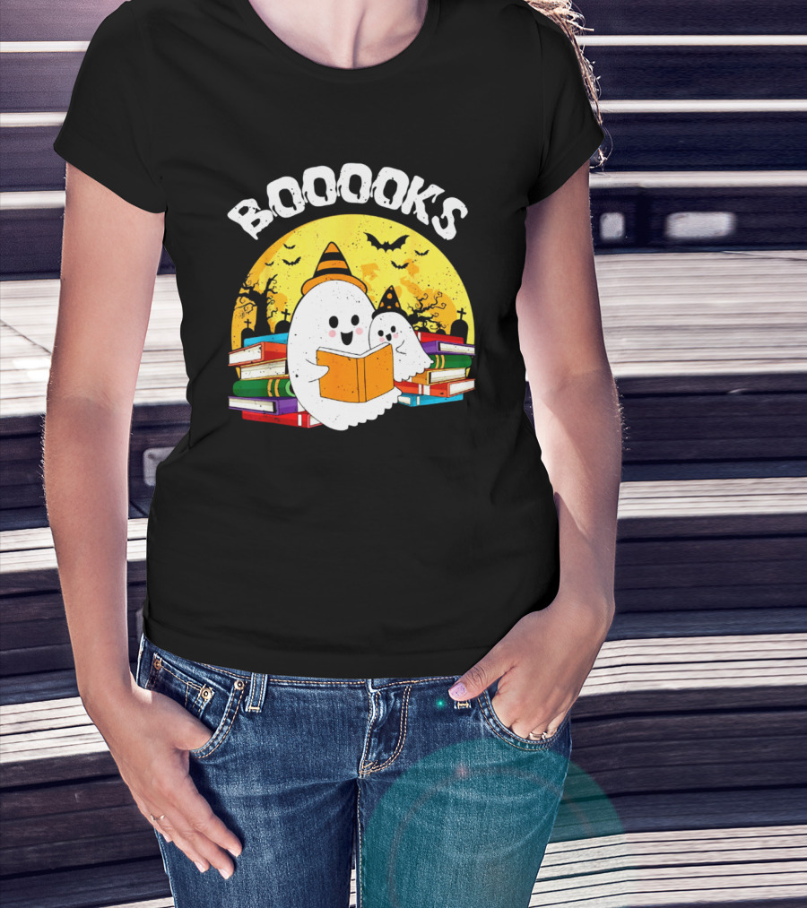 Booooks Ghost Reading Books Halloween Theme With Stacked Books And Bats T-Shirt