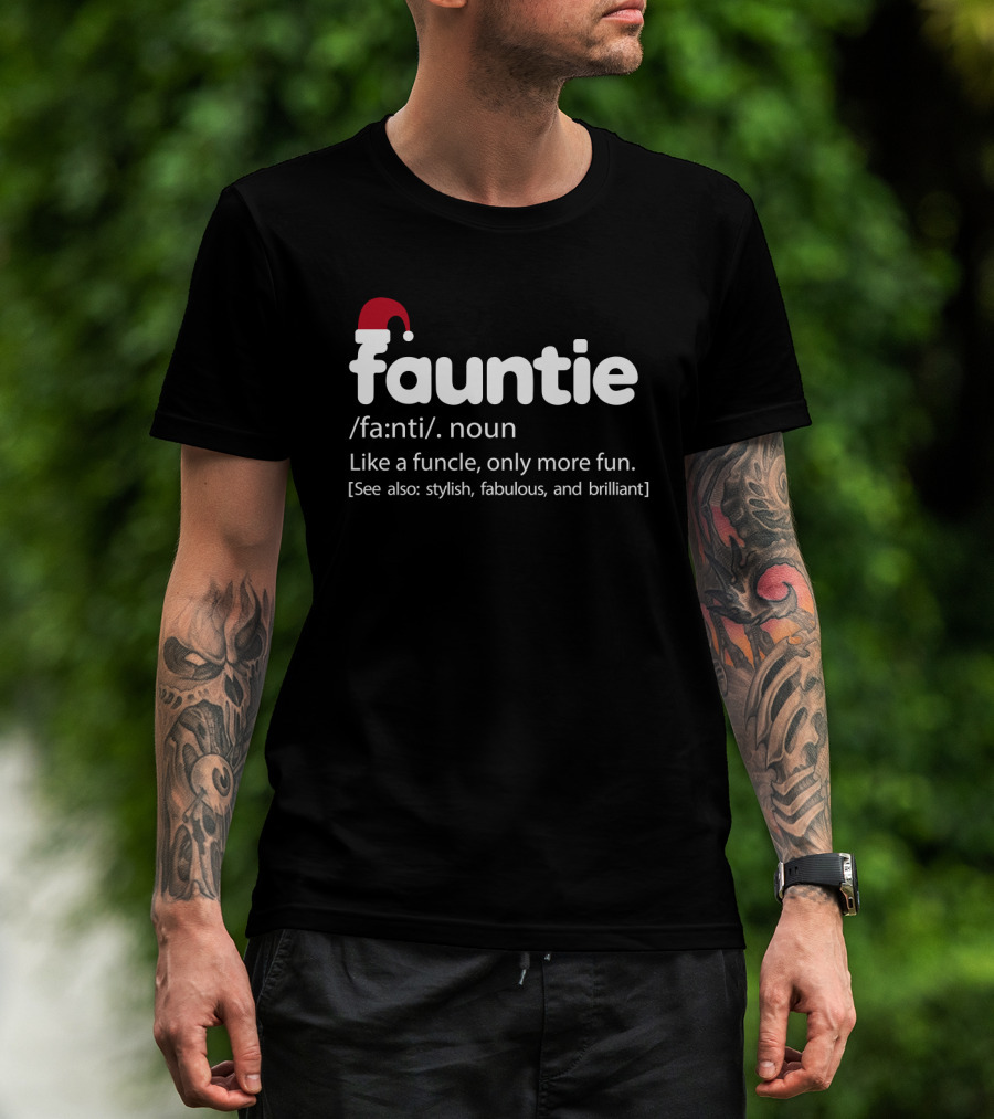 The Fauntie Noun Definition Like Funcle More Fun Stylish Fabulous Brilliant Santa Hat T-shirt is designed for everyday wear and a consistent fit. Fabric is pre-shrunk ring-spun cotton with durable stitching. See the size chart below for exact measurements.