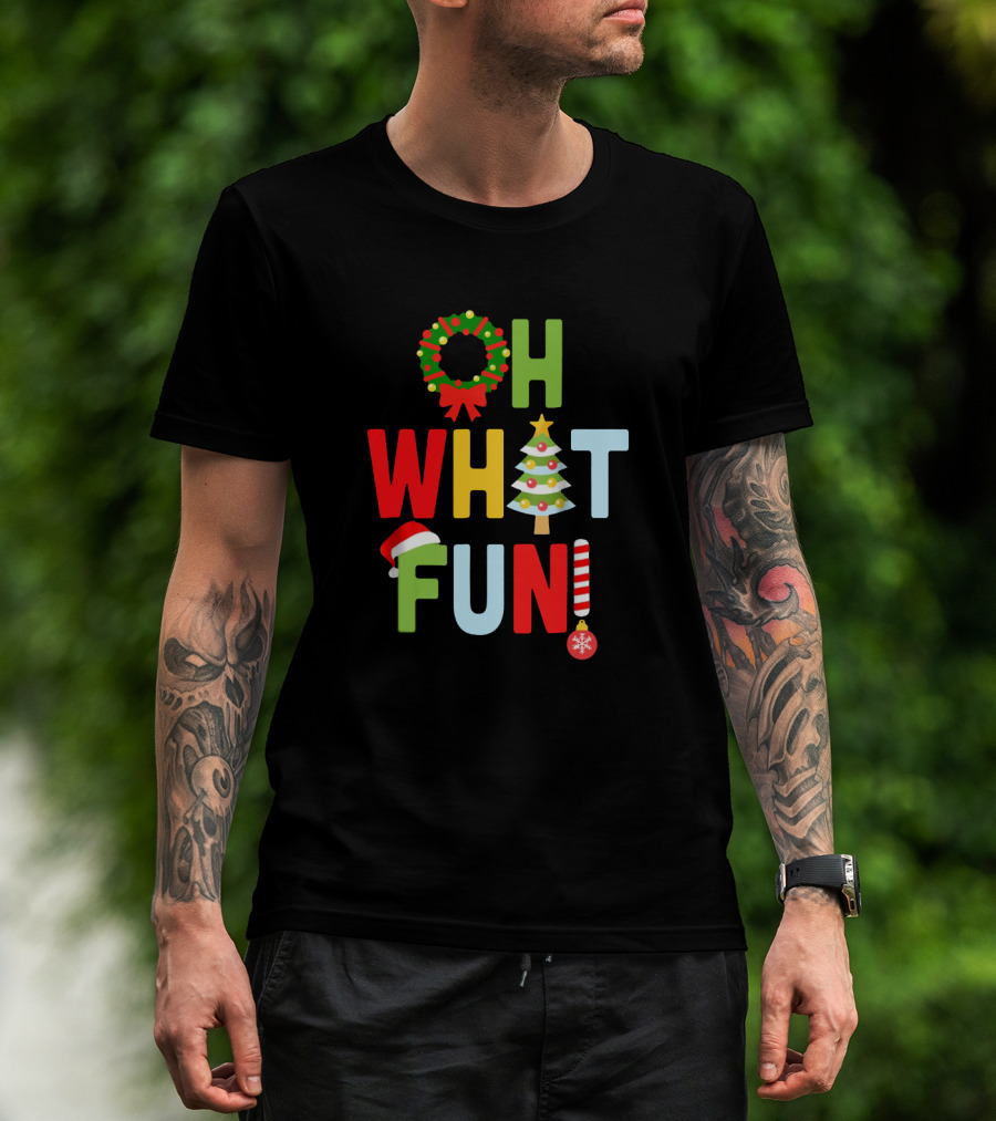 Oh What Fun Christmas With Wreath, Tree, Santa Hat, And Candy Cane T-Shirt