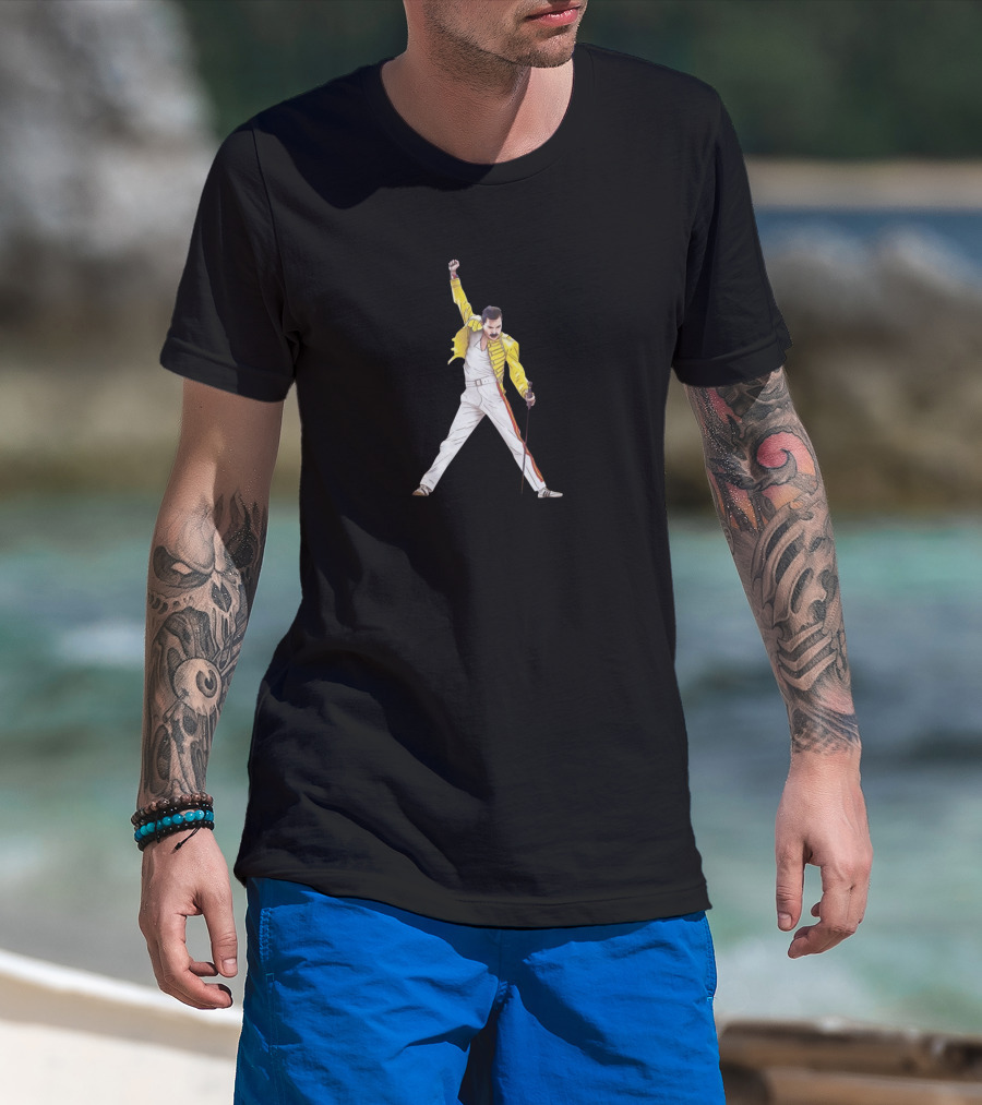 The The Show Must Go On Bohemian Rhapsody Iconic Yellow Jacket Pose T-shirt is designed for everyday wear and a consistent fit. Fabric is pre-shrunk ring-spun cotton with durable stitching. See the size chart below for exact measurements.