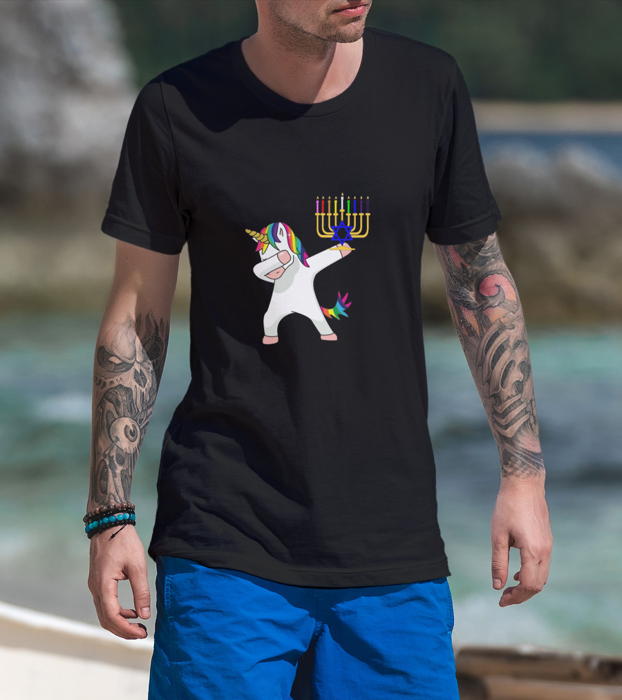 Unicorn Dabbing With Menorah Hanukkah Rainbow Mane And Tail T-Shirt