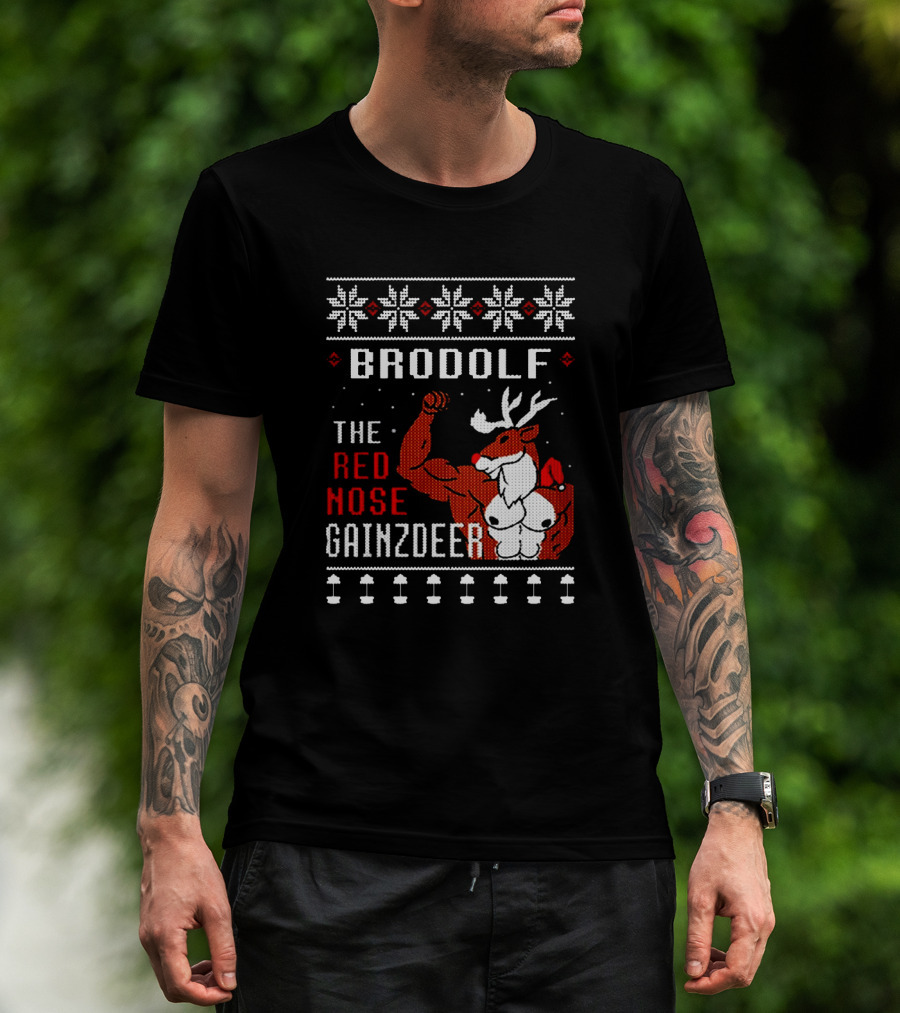 Brodolf The Red Nose Gainzdeer Christmas Sweater Featuring Buff Reindeer And Snowflake T-Shirt