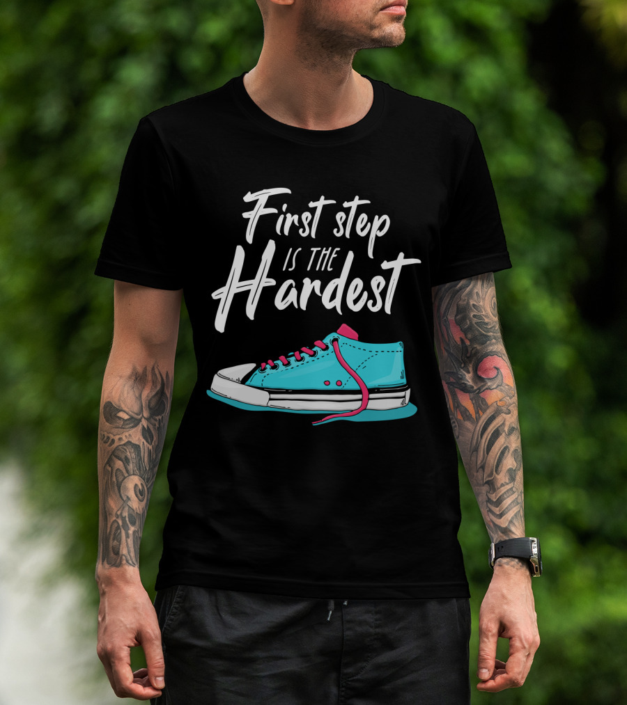 First Step Is The Hardest Blue Sneaker Graphic Motivation T-Shirt