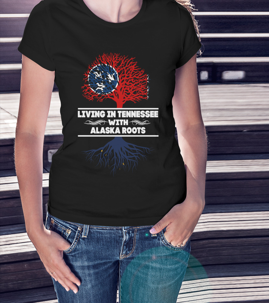 Living In Tennessee With Alaska Roots Red And Blue Tree With State Flags T-Shirt