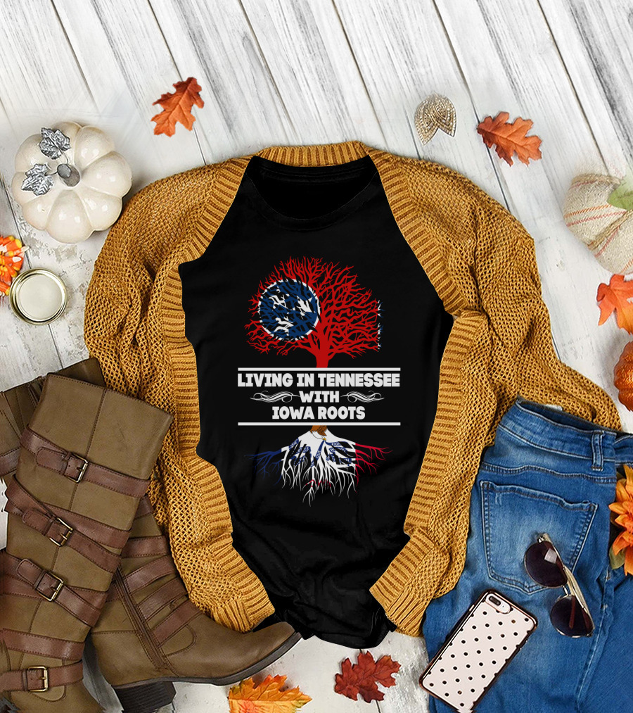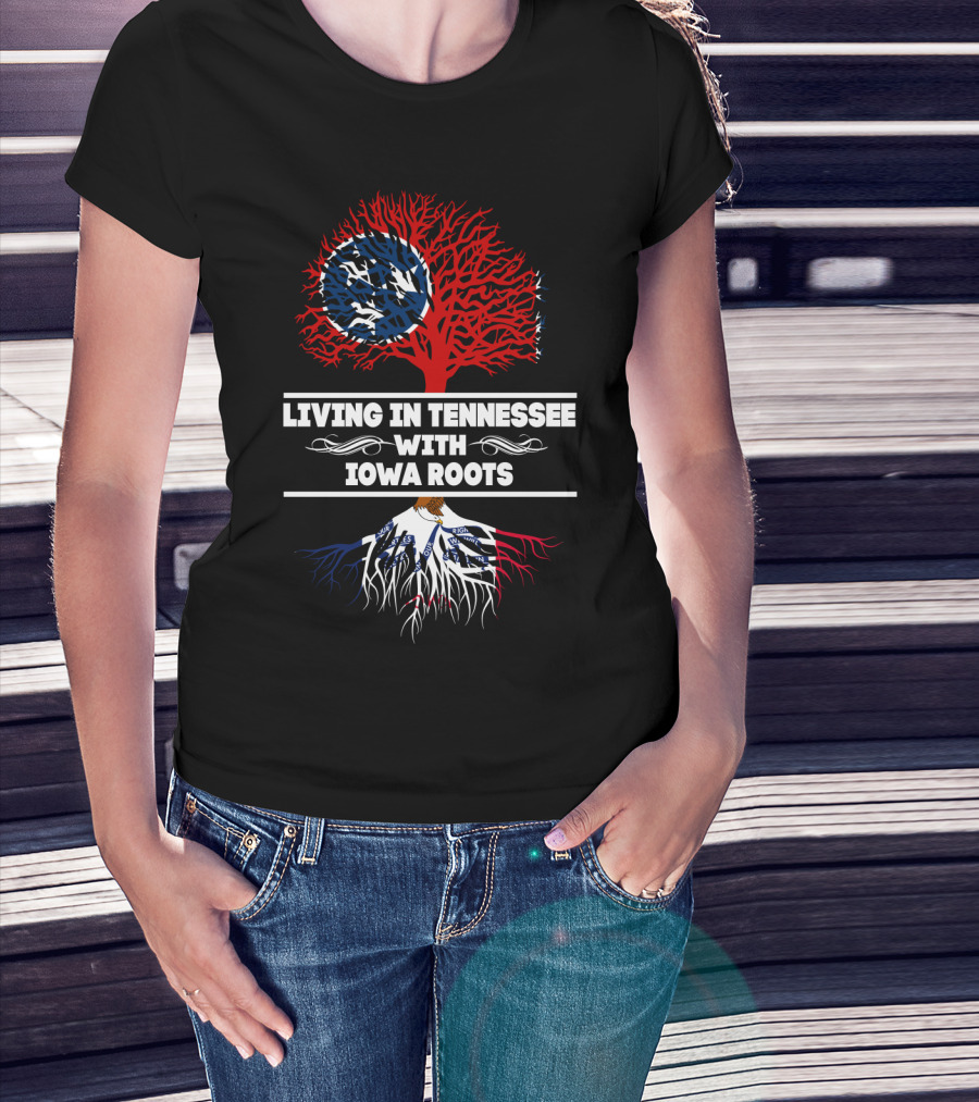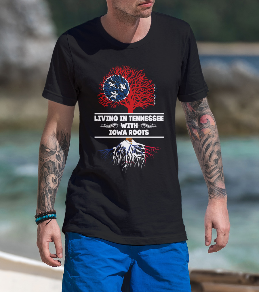 Living In Tennessee With Iowa Roots Tree Design Featuring State Flag Elements T-Shirt