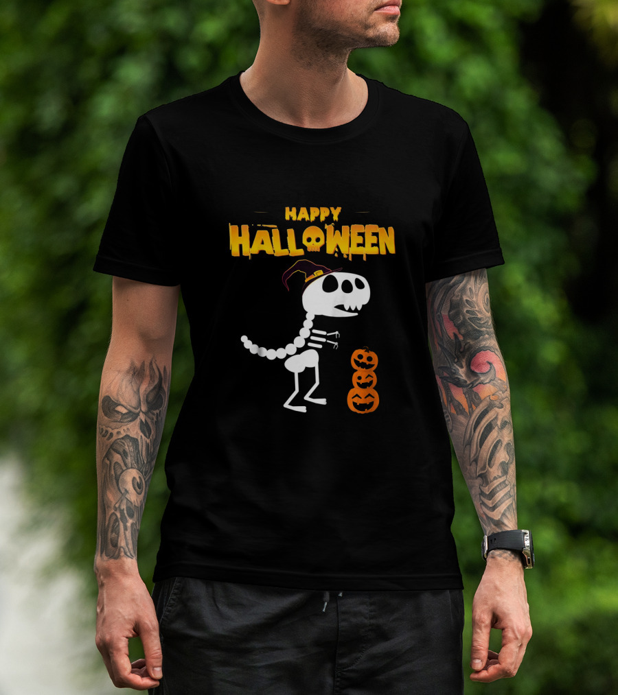 Happy Halloween Skeleton Dinosaur With Pumpkin Stack T-Shirt