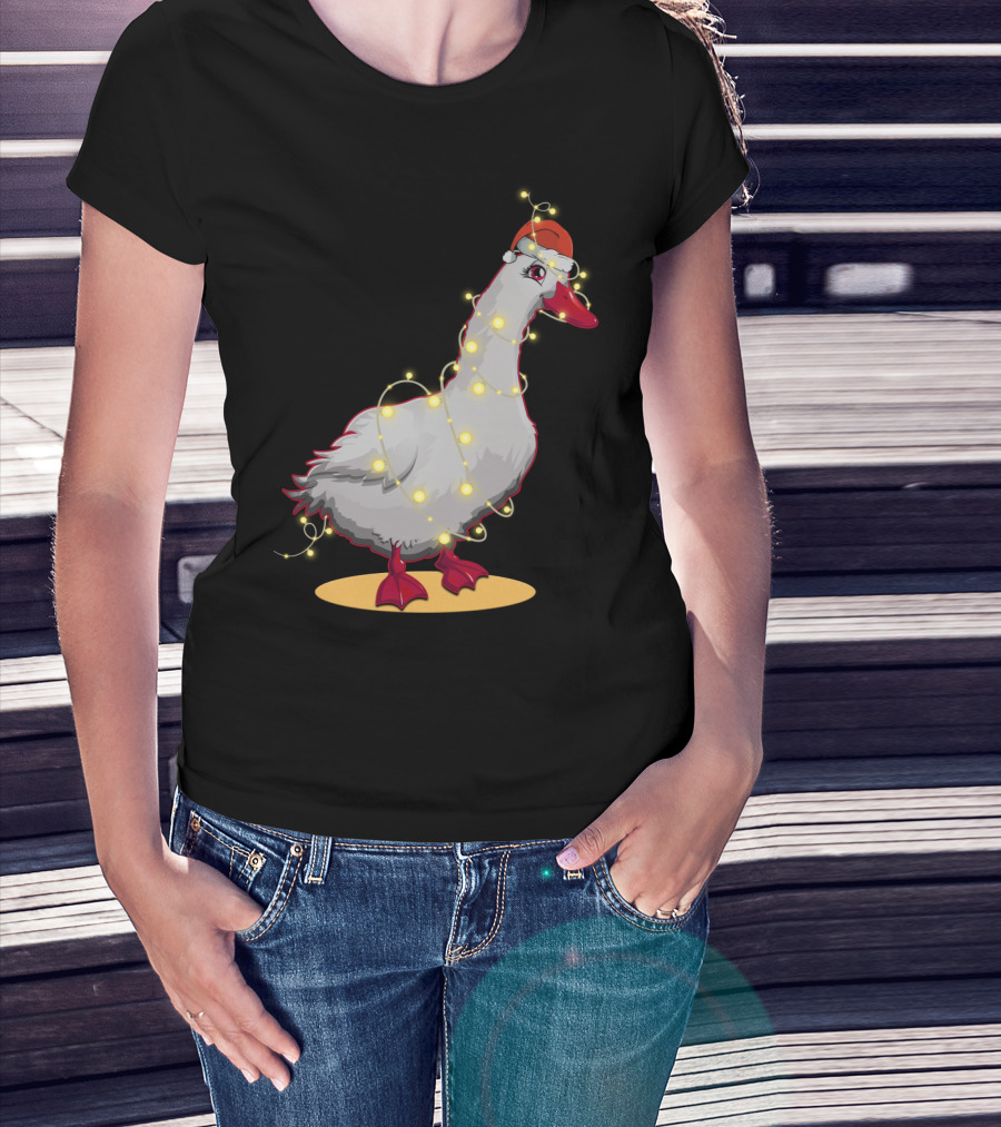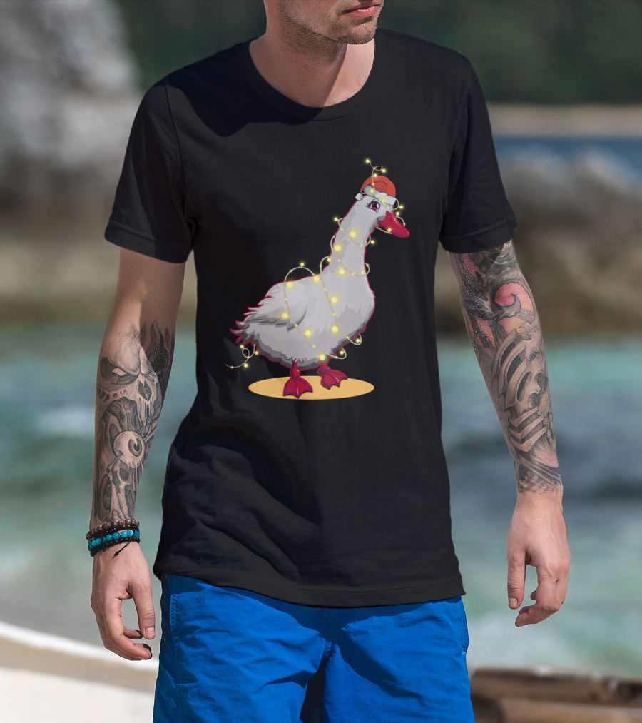 Christmas Lights Duck Wrapped In Festive String With Santa Hat T-Shirt