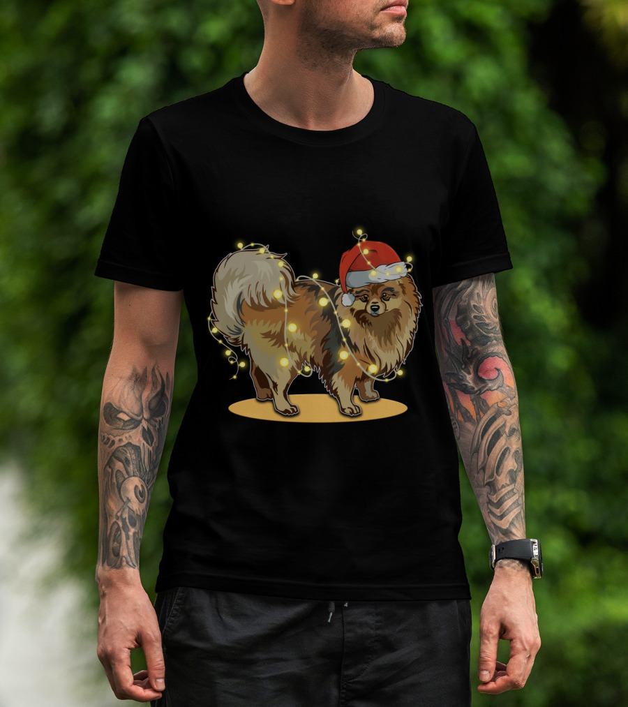 Pomeranian Wrapped In Christmas Lights Wearing Santa Hat T-Shirt