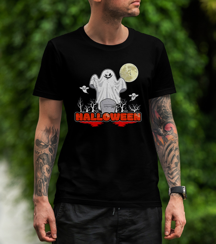 The Halloween Ghostly Spirits with Haunted Moonlit Trees T-shirt is designed for everyday wear and a consistent fit. Fabric is pre-shrunk ring-spun cotton with durable stitching. See the size chart below for exact measurements.