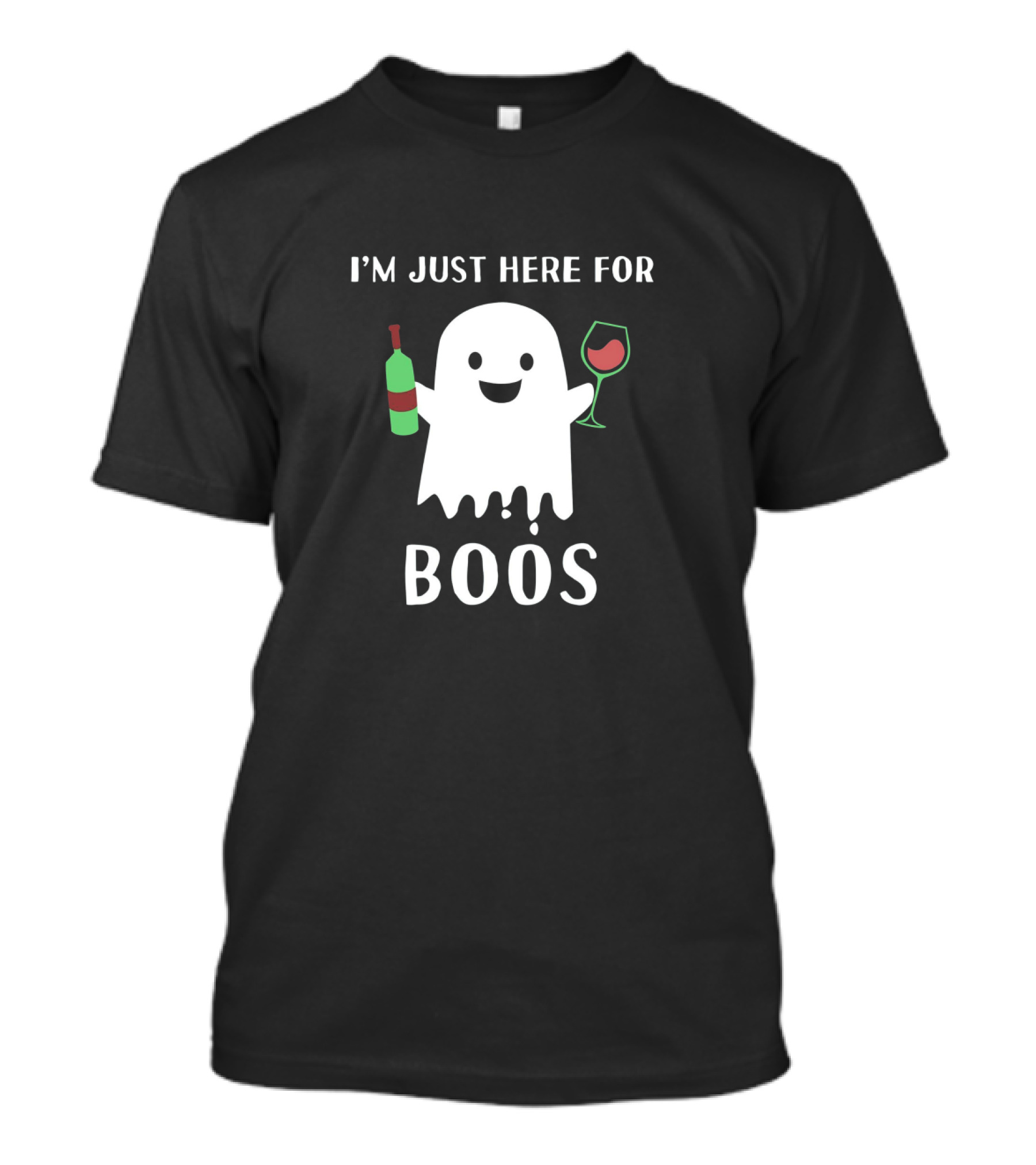 I'm Just Here For Boos With Ghost Holding Wine Bottle And Glass Funny Halloween T-Shirt