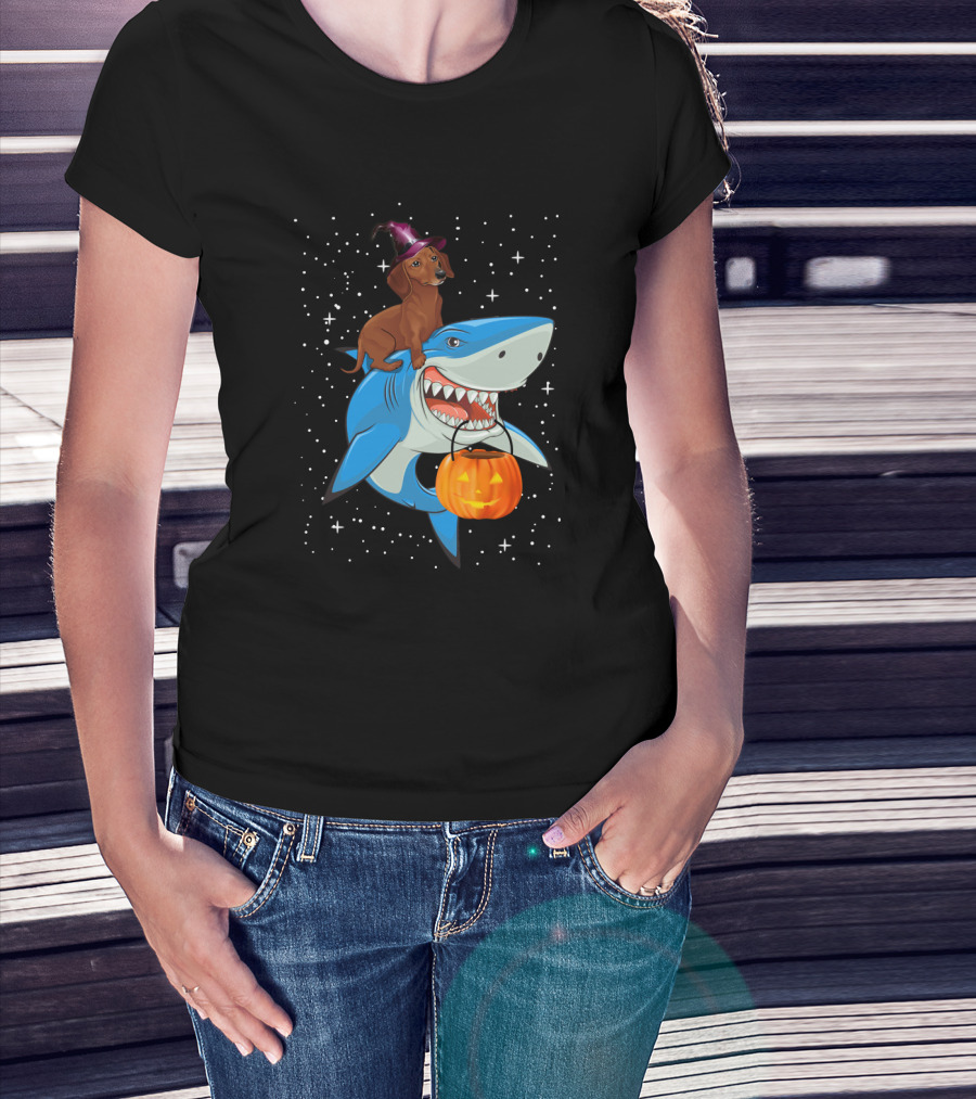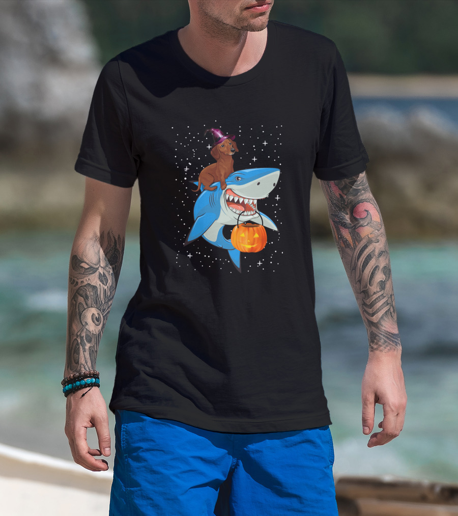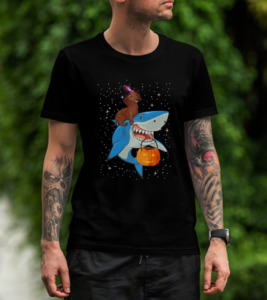The Dachshund Witch on Shark Carrying Jack-o'-Lantern in Starry Halloween Sky T-shirt is designed for everyday wear and a consistent fit. Fabric is pre-shrunk ring-spun cotton with durable stitching. See the size chart below for exact measurements.